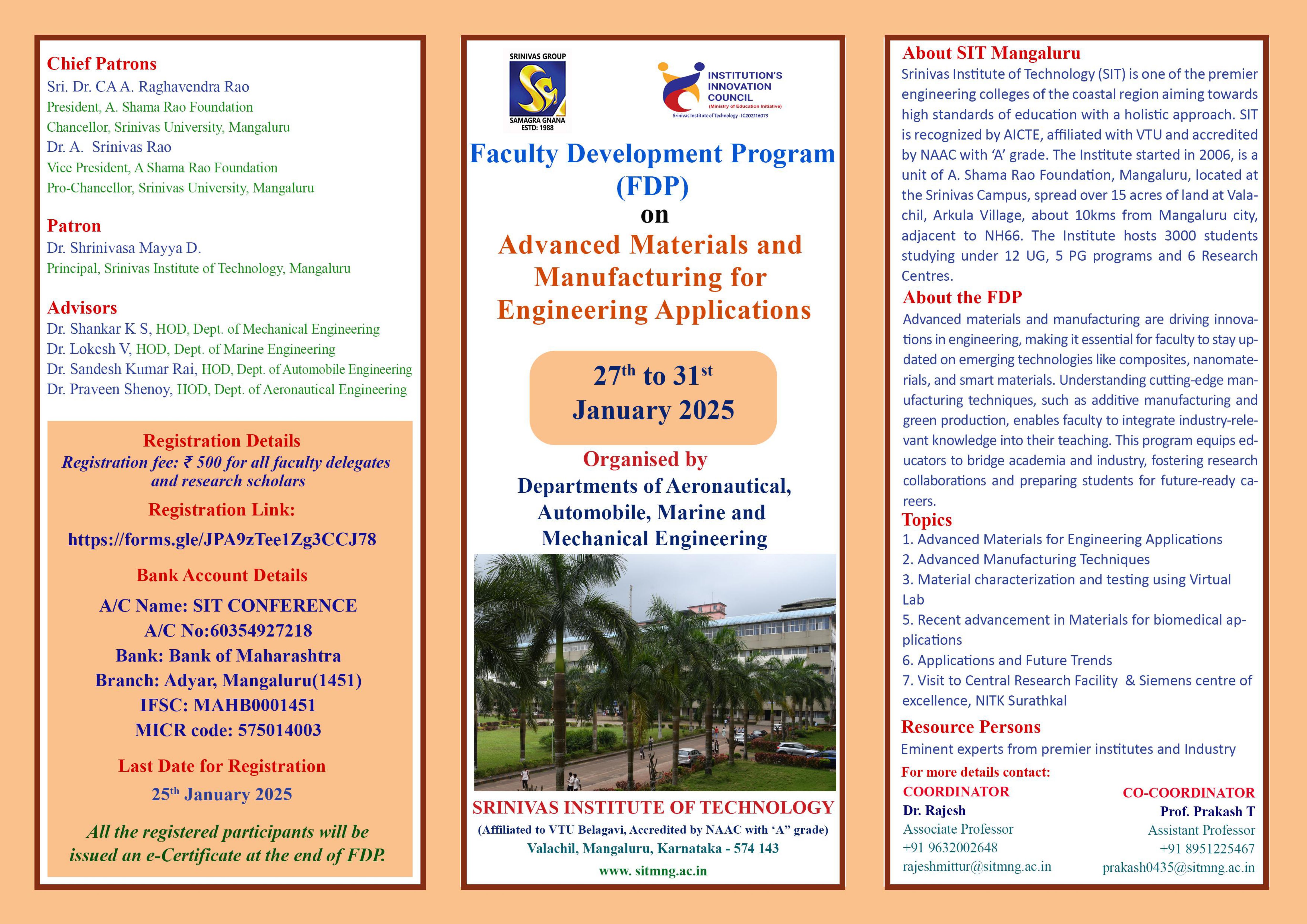 Dear Esteemed Colleagues, We are delighted to announce the Faculty Development Program (FDP) on Advanced Materials and Manufacturing for Engineering Applications, which will be held from 27th to 31st January 2025. This program aims to provide a platform for academicians, researchers, and industry professionals to explore cutting-edge advancements and innovations in the domain of materials and manufacturing technologies. Participants will gain valuable insights into the latest research trends, methodologies, and practical applications that are shaping the future of engineering. We cordially invite you to join us in this enriching journey of knowledge sharing and professional growth. Stay tuned for more details regarding the agenda, resource persons, and registration process.