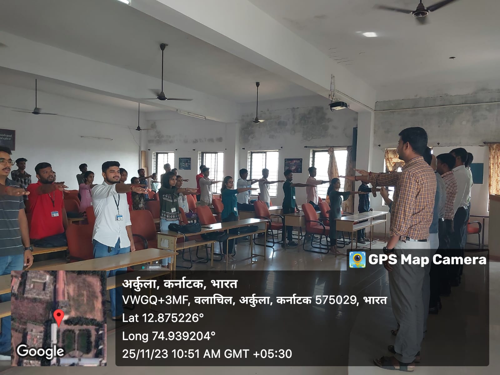 NSS volunteers of each department has celebrated Constitution Day on 25/11/23 in their respective department classrooms. Principal Dr.Shrinivasa Mayya D. addressed student volunteers and reminded them of their constitutional responsibilities.Department NSS coordinators with their respective HOD,s read the preamble of the constitution along with their volunteers.Many students also got the digital certificates for reading the preamble online and attending the quiz.Department coordinators spoke about the Indian constitution and also elaborated on it’s significance as it reinforces civic values, educate citizens about their constitutional rights and promotes a deeper understanding of the democratic principles that guide the nation. Department faculty members were also present during the occasion.