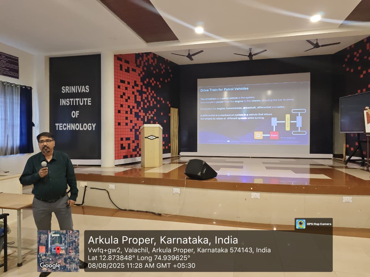 The Department of Aeronautical and Automobile Engineering of Srinivas Institute of Technology Valachil Mangaluru in association with the Institution’s Innovation Council IIC organized a session on Innovation and Entrepreneurship in Electric Vehicle Technologies on 8th August 2025 at the AC Seminar Hall The resource person for the session was Mr Sudarshana Karkala Co Founder and EV Engineer at CAR Software System Bengaluru Dr Praveen Shenoy Head of the Department of Aeronautical Engineering and IIC Coordinator and Dr Sandesh Kumar Rai Head of the Department of Automobile Engineering addressed the audience and highlighted the significance of electric vehicle technologies in the current global scenario Mr Sudarshana Karkala delivered an insightful talk focusing on recent innovations in the electric vehicle sector entrepreneurial opportunities and the integration of modern software systems in EV development He also emphasized the scope for budding engineers to contribute to the sustainable mobility ecosystem through innovation and start up ventures The program was coordinated by Mr Prakash T and Mr Vinod Kumar Staff Coordinators It was organized with the full support of Dr Shrinivasa Mayya D Principal of Srinivas Institute of Technology whose backing underscored the institution’s commitment to fostering an environment that values educational excellence and holistic student development The event concluded with Mr Karan Rai a 5th semester Automobile Engineering student delivering the vote of thanks The session ended with an interactive Q and A where participants clarified their queries and discussed potential ideas for projects and startups in EV technologies The session began at 1100 AM with Ms Kamalatha Y Shetty a 5th semester Aeronautical Engineering student extending a warm welcome to the gathering Mr Dheeraj D a 7th semester Automobile Engineering student introduced the chief guest and Ms Kavya C Mutta a 7th semester Aeronautical Engineering student served as the master of ceremonies