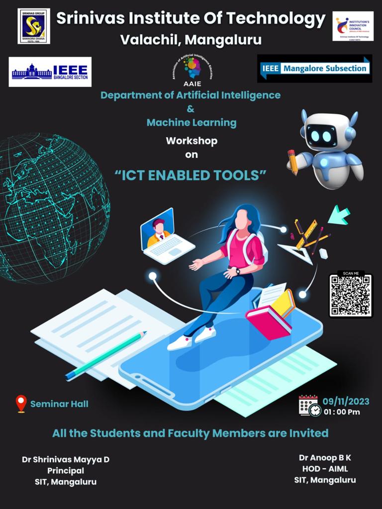 Objectives of the Technical Talk on ICT-Enabled Tools Date: November 9, 2023 Time: 2:00 PM - 4:00 PM Venue: Seminar Hall, Srinivas Institute of Technology, Mangaluru Resource Person: Mr. Vivek, Department of Marine Engineering Target Audience: Students from the Artificial Intelligence and Machine Learning (AIML) Department at Srinivas Institute of Technology.
