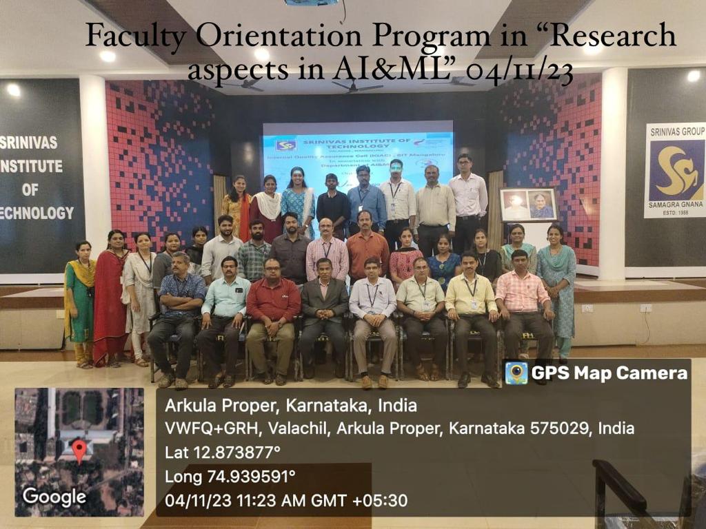 The Faculty Orientation Event, titled Research Aspects of AIML,was held at the Srinivas Institute of Technology on 04/11/2023. The event aimed to provide valuable insights into the field of Artificial Intelligence and Machine Learning (AIML) and its significance in the education sector. Dr. Anoop B K, an esteemed expert in the field, served as the resource person for the event.