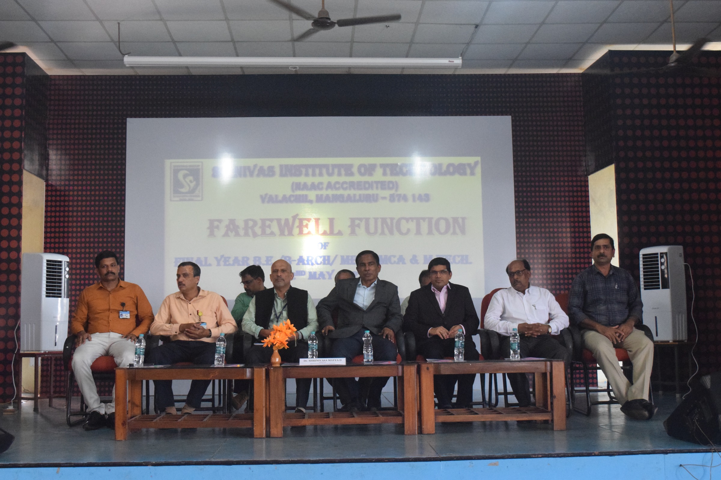 The Srinivas Institute of Technology, Valachil, Mangaluru bid a heartfelt farewell to its outgoing students on 22nd May 2023. The programme was presided by Dr. Shrinivasa Mayya D, Principal of the Institute. The event, organized to commemorate the achievements and memories of the departing students, was graced by distinguished personalities including Mr. Ananth Kulkarni, Students Welfare Officer and Head of the departments of Various departments.