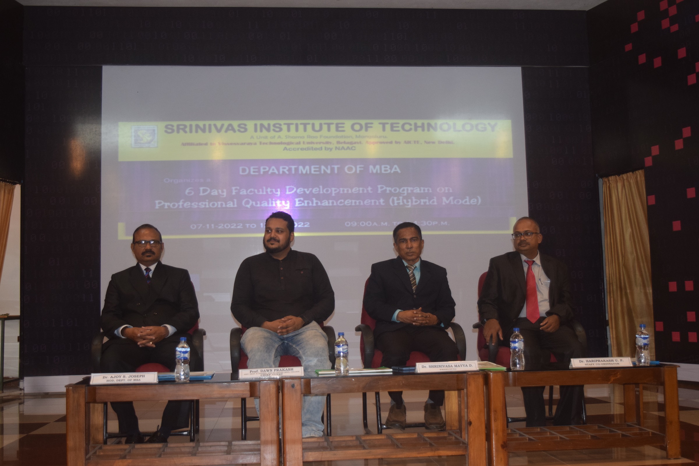 6 Days Faculty Development Program on “Professional Quality Enhancement” was organized by MBA department of Srinivas Institute of Technology, Valachil Mangalore from 7th to 12th November 2022. The Two Day International Conference was inaugurated by Prof.Dawn Prakash,Assistant Professor & Trainer, SDM PG Centre (MBA), Mangalore. He in his inaugural address highlighted new technology can simplify our academic works. The formal function was inaugurated by lighting the lamp by the dignitaries.