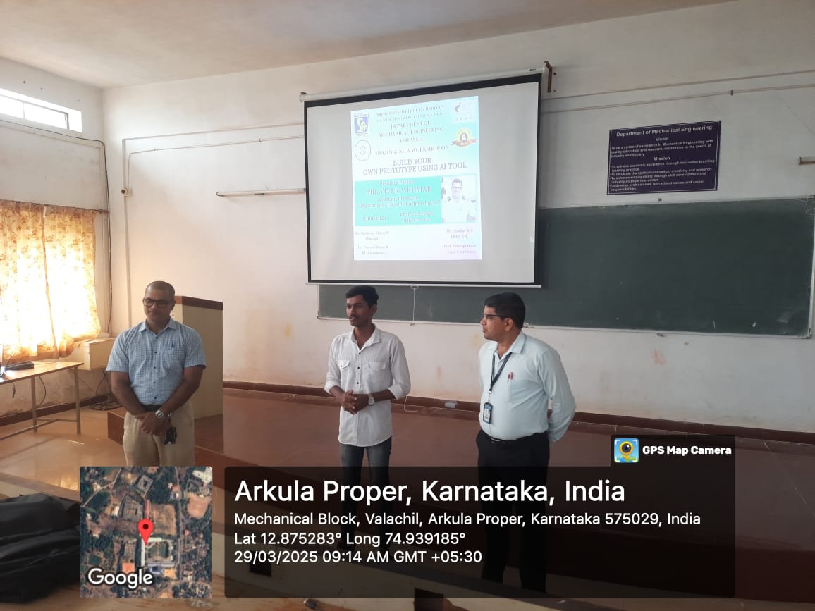 SRINIVAS INSTITUTE OF TECHNOLOGY, MANGALURU Department of Mechanical Engineering Department of Mechanical Engineering in association with All Students Mechanical Association (ASMA) organized a one day workshop on Build your own prototype using AI tool on 29th March 2025...