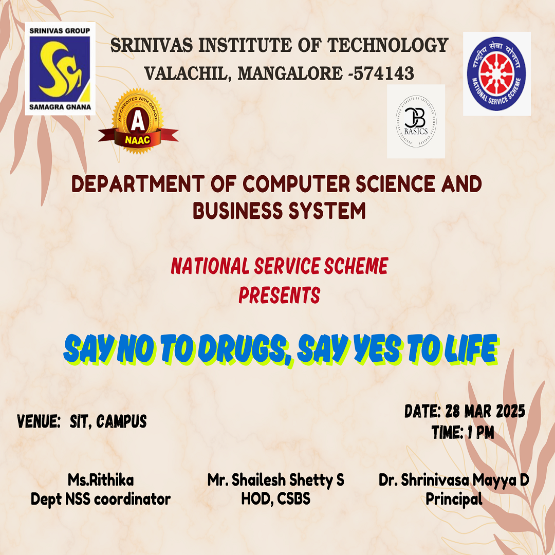 SRINIVAS INSTITUTE OF TECHNOLOGY, MANGALURU Department of Computer Science & Business System The Department of Computer Science & Business System (CSBS) at SIT, in collaboration with the National Service Scheme (NSS), successfully organized an awareness campaign titled Say Yes to Life, No to Drugs...