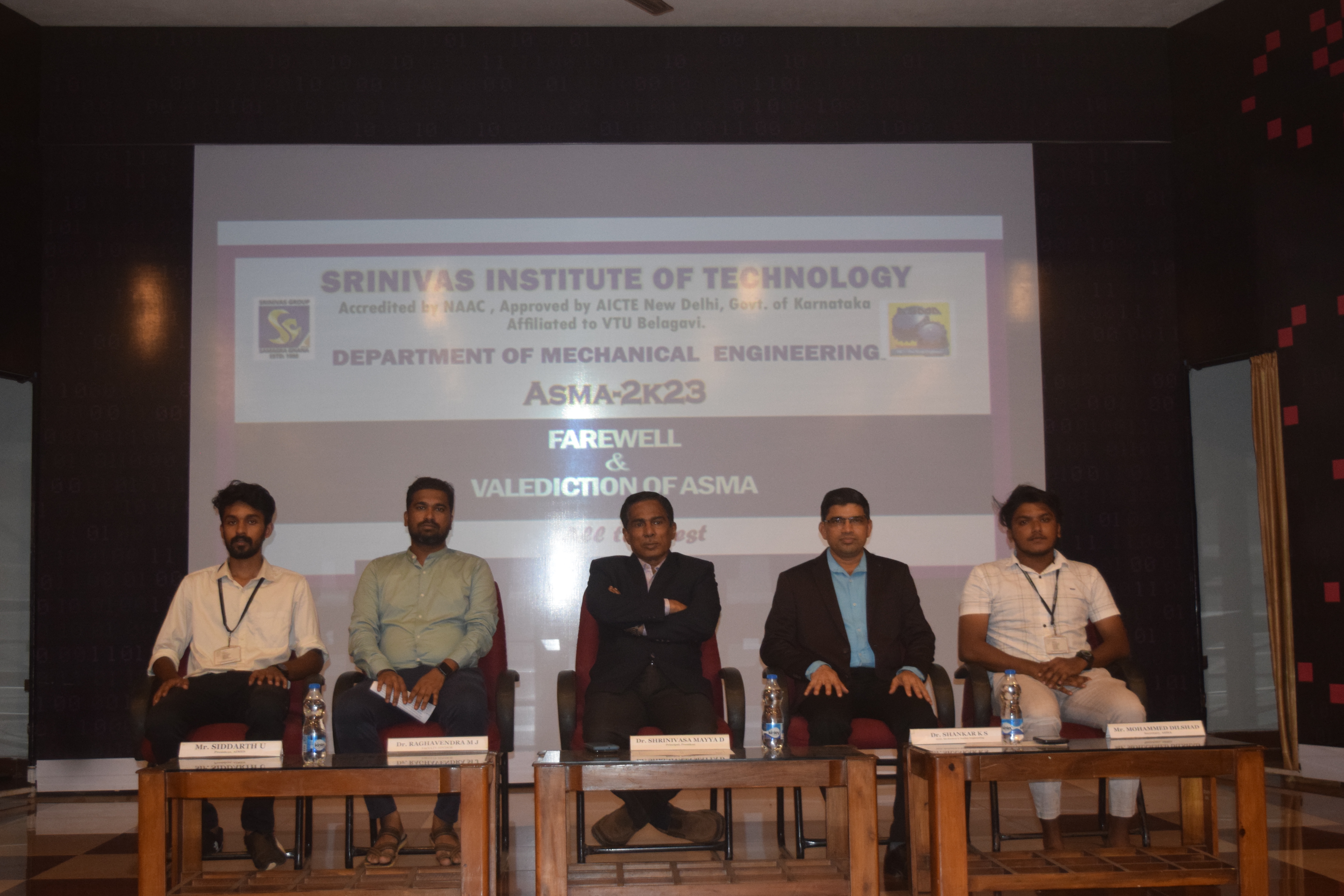 The valedictory function of Mechanical Club “All Students Mechanical Association (ASMA)” and farewell to the final year Mechanical Engineering students was organized by the Department of Mechanical Engineering on 30th May 2023. Dr. Shrinivasa Mayya D, Principal of Srinivas Institute of Technology was the president of the function and addressed the graduating students, urging them to exhibit professionalism in their future endeavors