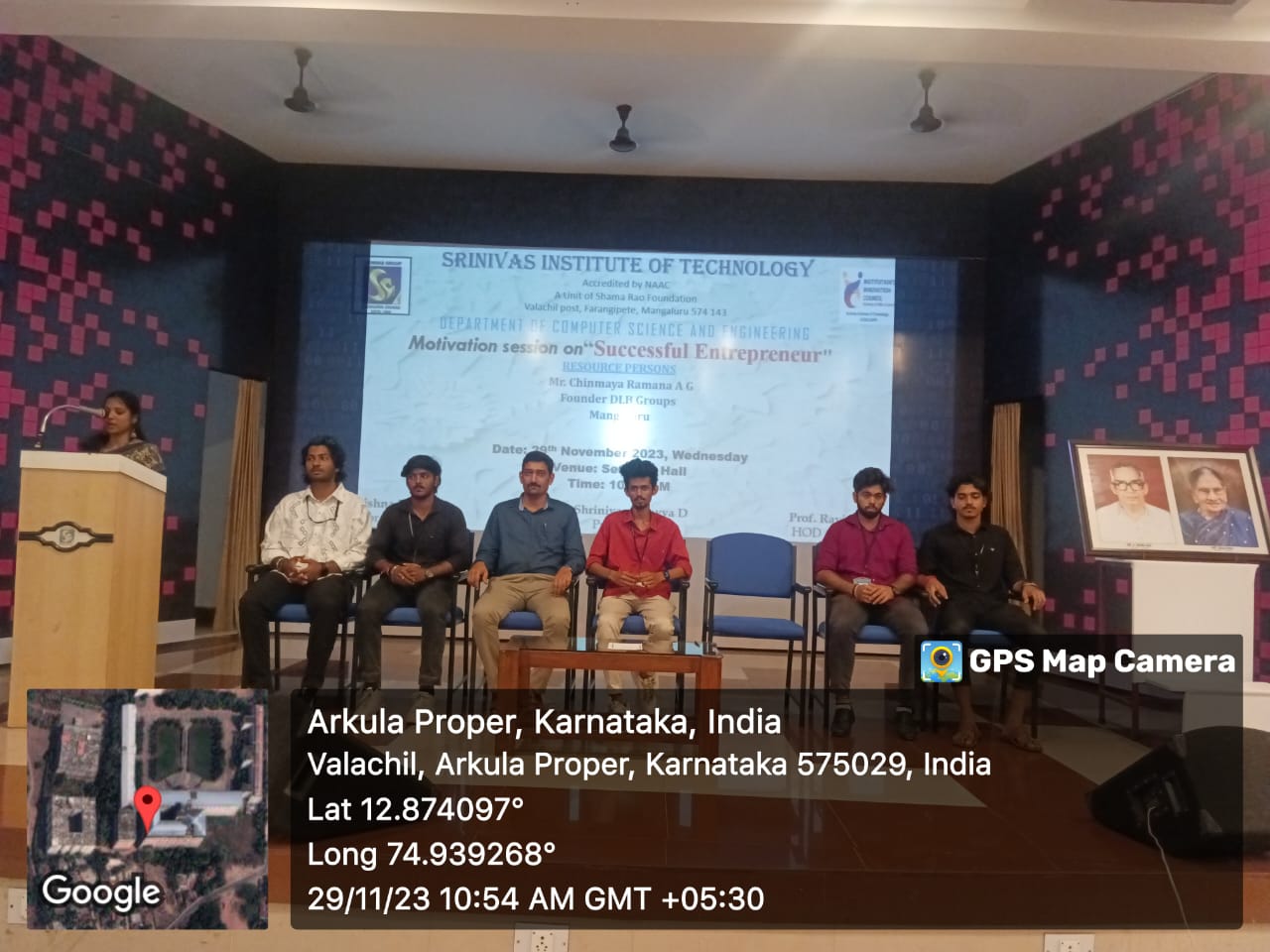 A Motivational session on “Successful Entrepreneur” was conducted at Srinivas Institute of Technology, Mangaluru on 29th November 2023. The session was organized by the Department of Computer Science and Engineering in association with Institution Innovation Council (IIC).
