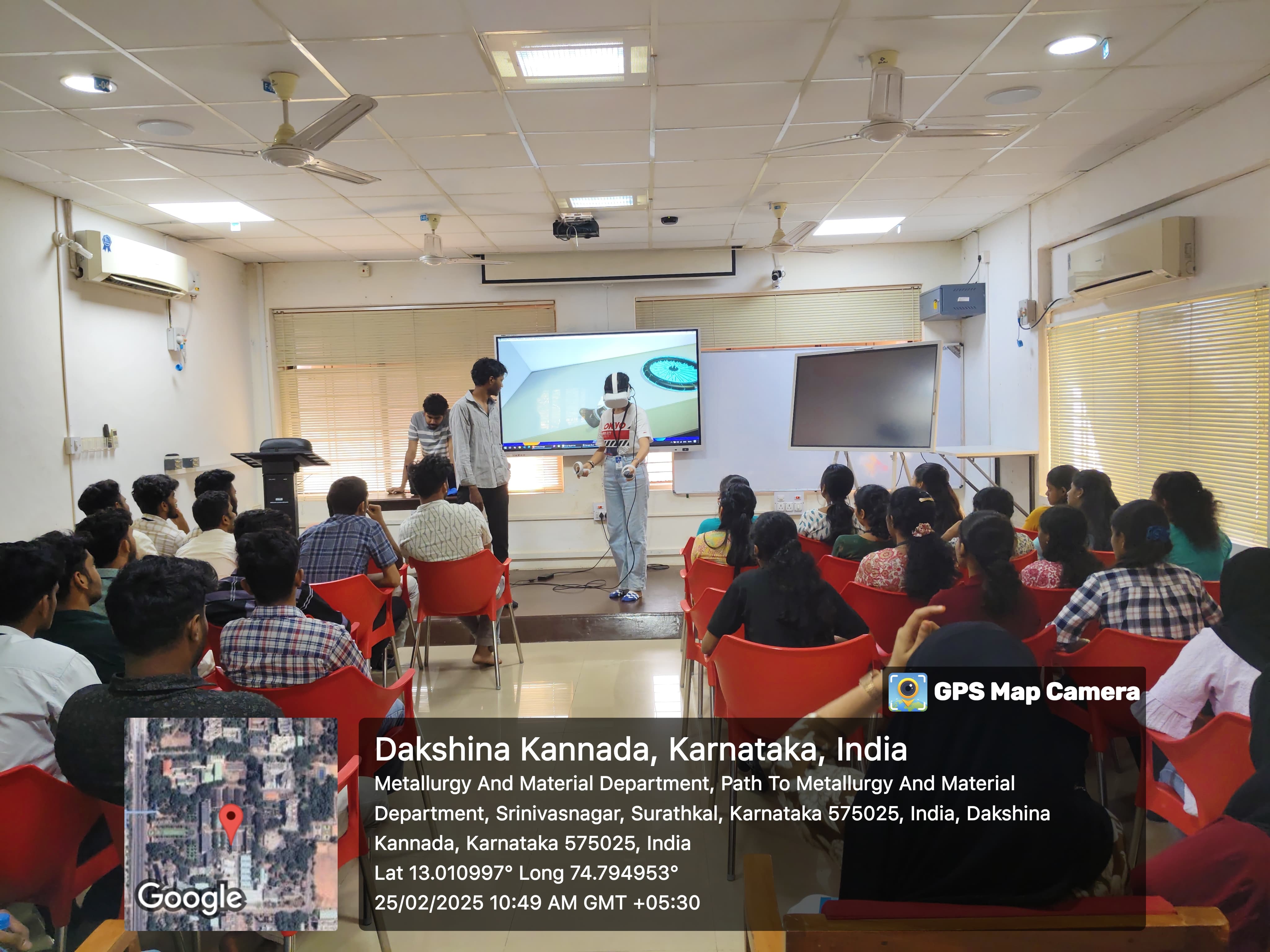 Mangaluru, February 25, 2025: The 6th-semester AIML students from Srinivas Institute of Technology visited the CSD Lab at NITK Surathkal under the guidance of Prof. Parvathraj K M M and Prof. Nithya B P. The visit covered AR/VR technologies, UAV applications, electric cycle manufacturing, Virtual Labs, and multiple advanced labs, enhancing students' exposure to cutting-edge technologies.