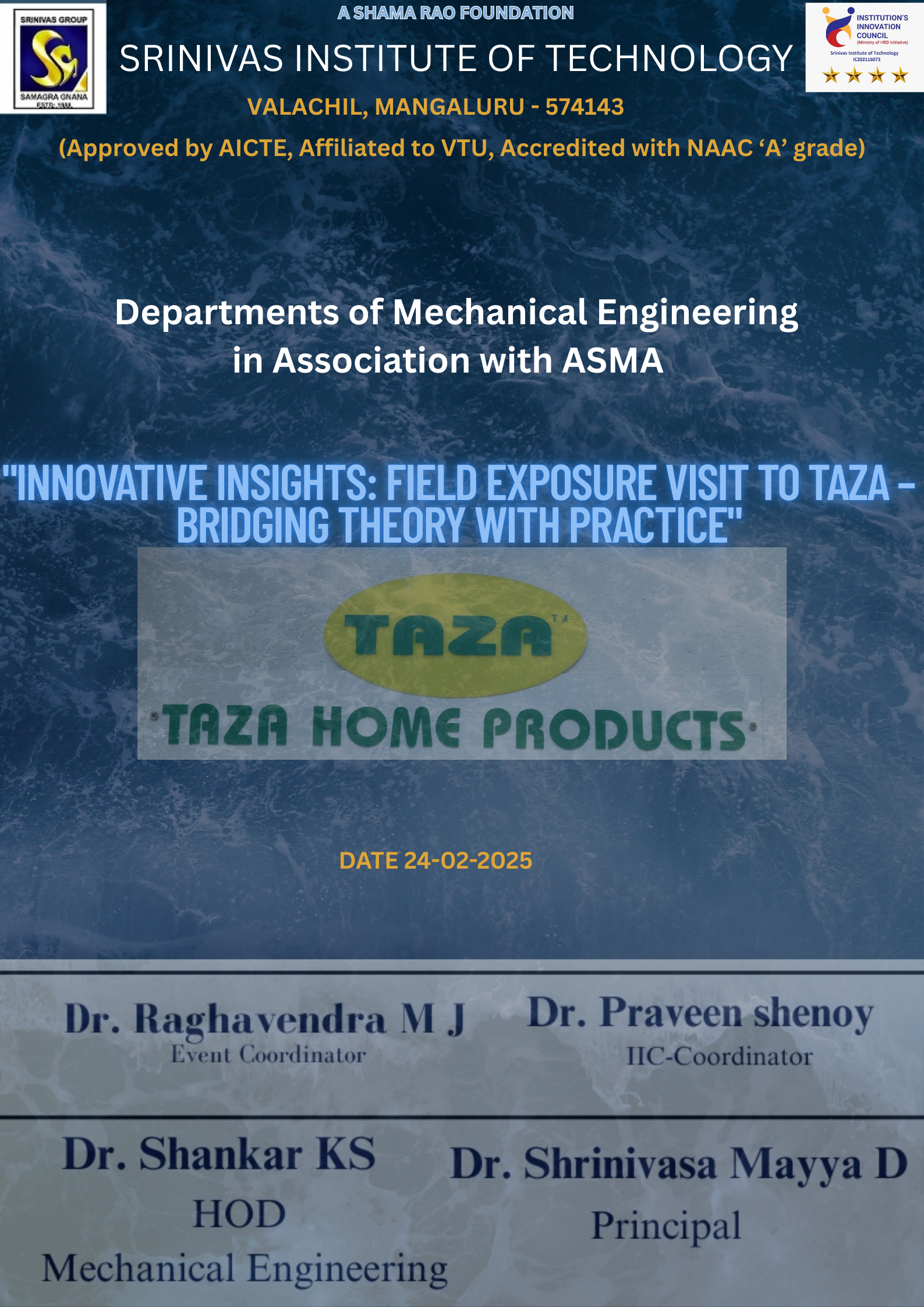 SRINIVAS INSTITUTE OF TECHNOLOGY, MANGALURU Institution's Innovation Council (IIC) in collaboration with All Student Mechanical Association (ASMA) On 24-02-2025, the Institution's Innovation Council (IIC) of Srinivas Institute of Technology, Mangaluru, in collaboration with the All Student Mechanical Association (ASMA), organized a Field Exposure Visit to TAZA...