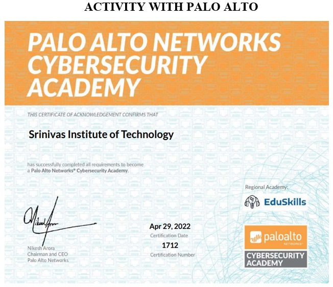 Srinivas Institute of Technology has tie up with Paloalto Networks in the academic year 2022.