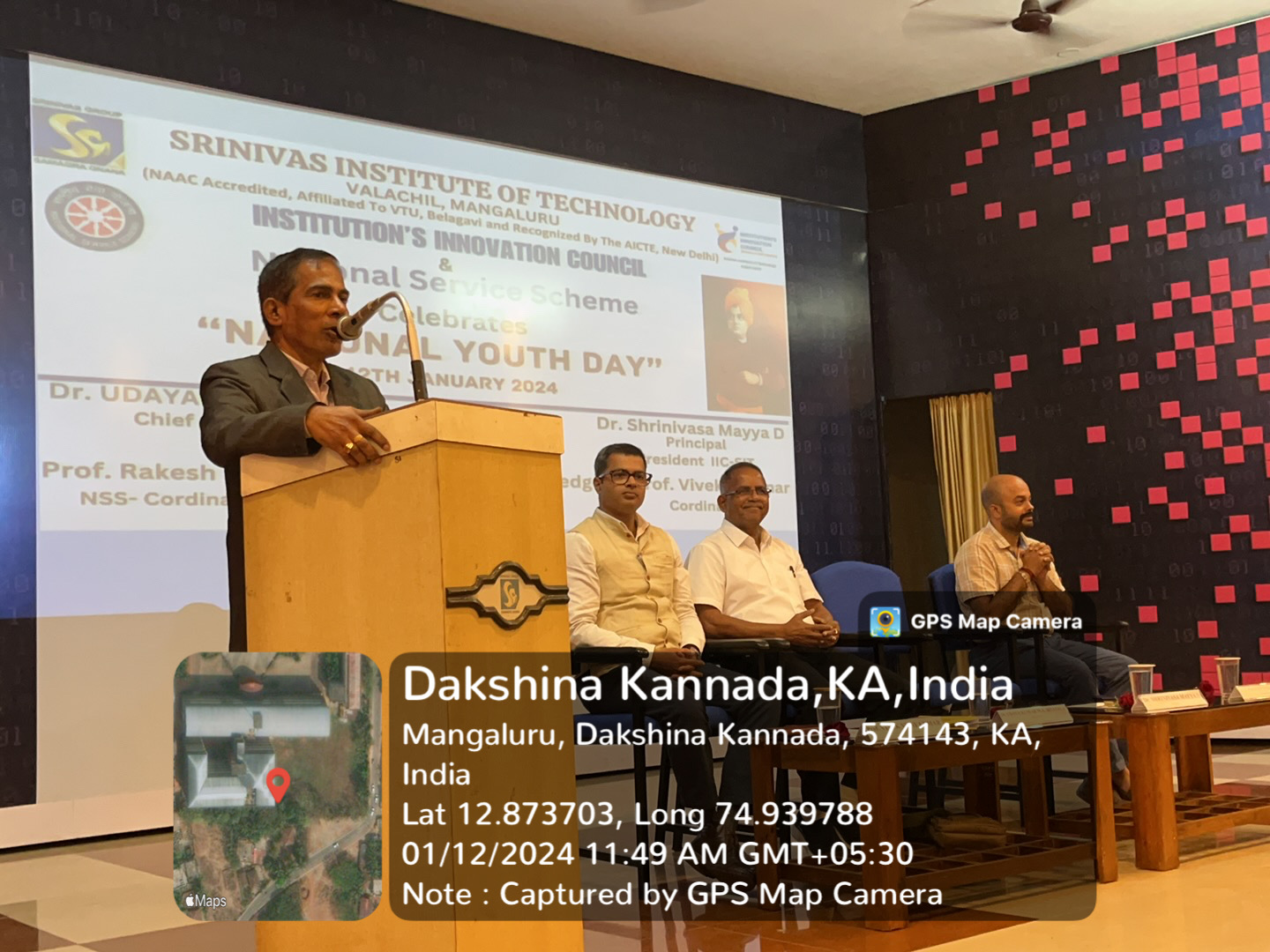 MANGALORE, India – January 12, 2024 – Srinivas Institute of Technology ,marked the occasion of National Youth Day with an inspiring and educational celebration held on January 12, 2024, in the institution's Seminar Hall. The event, jointly organized by the Institution's Innovation Council (IIC) and the National Service Scheme (NSS), brought together esteemed guests, faculty members, and enthusiastic students to commemorate the birthday of the legendary Swami Vivekananda, a true icon and harbinger of hope and happiness for the youth of India. The occasion was graced by a distinguished Chief Guest Dr. Udaya Kumar M.A. Irvathur, former Principal of University College, Mangalore, who delivered a thought-provoking address on the topic,Swami Vivekananda - Harbinger of Hope and Happiness for Young India, which further deepened the understanding of Swami Vivekananda's profound influence on the youth. Principal Dr. Shrinivasa MayyaD , the president of the function took the stage to share valuable insights on how engineers and students can draw inspiration from Swami Vivekananda's principles and apply them to their academic and personal journeys. His speech resonated with the attendees, highlighting the enduring relevance of Swami Vivekananda's ideals in today's world. The eventwas coordinated by Prof. Vivek Vijay Kumar who delivered the welcome address. The event's proceedings were kicked off with an invigorating invocation by Devayani from the Marine Engineering department, followed by a warm welcome speech by Prof. Vivek Vijay Kumar. The vote of thanks was graciously delivered by Prof. Rakesh Mallya P, expressing gratitude to all those who contributed to the success of the event. Adding to the vibrancy of the celebration were the talented MCs, Ninaada B.K. and Sanjana S.K., both from the Marine Engineering department. Their lively commentary and engaging interaction with the audience ensured that the event was both informative and entertaining. The event not only paid homage to the great Swami Vivekananda but also served as a platform for young minds to connect with his visionary ideas and principles. Srinivas Institute of Technology remains committed to fostering the growth and development of its students, nurturing them to become responsible, enlightened, and compassionate citizens of India.
