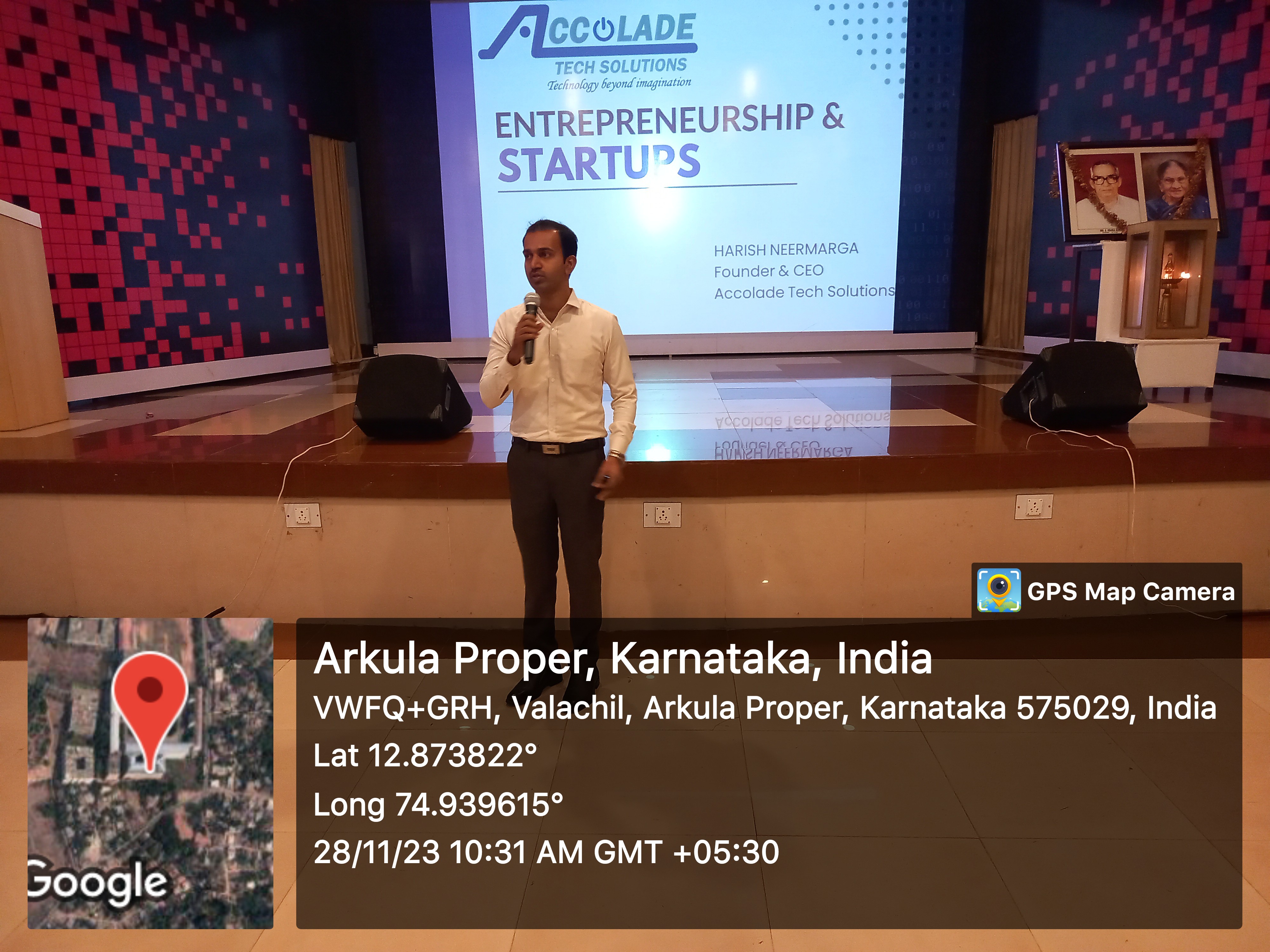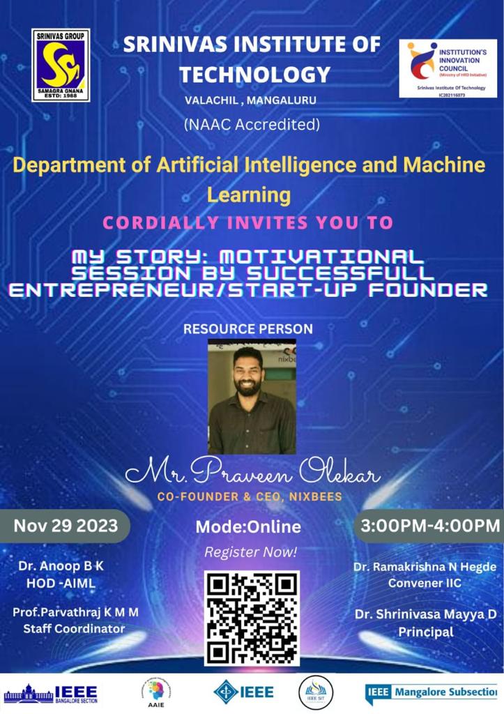The Association of Artificial Intelligence and Data Science Department, AADE, and the Institution’s Innovation Council (IIC) organized the visit to students of 3rd-semester Artificial Intelligence and Data Science visited NaVinod Technologies LLP(Aykan®) Skill house, Mangaluru on 29-11-2023.Ganapathi Sharma Attachments Nov 30, 2023, 1:31 PM (4 days ago)to me Department of Electrical &Electronics Engineering of Srinivas Institute of Technology and Institution’s Innovation Council (IIC) jointly organized programme on“My Story – Motivational Session by Successful Entrepreneur/Startup founder” on November 29, at 11:00am in Research Lab of Library Block to inspire the students and educate them about the importance of Entrepreneurship, the challenges that they will come across and how to overcome it.Mr. BharathKumar, founder of M4S Marketing Company and M4S Finance was the guest speaker.