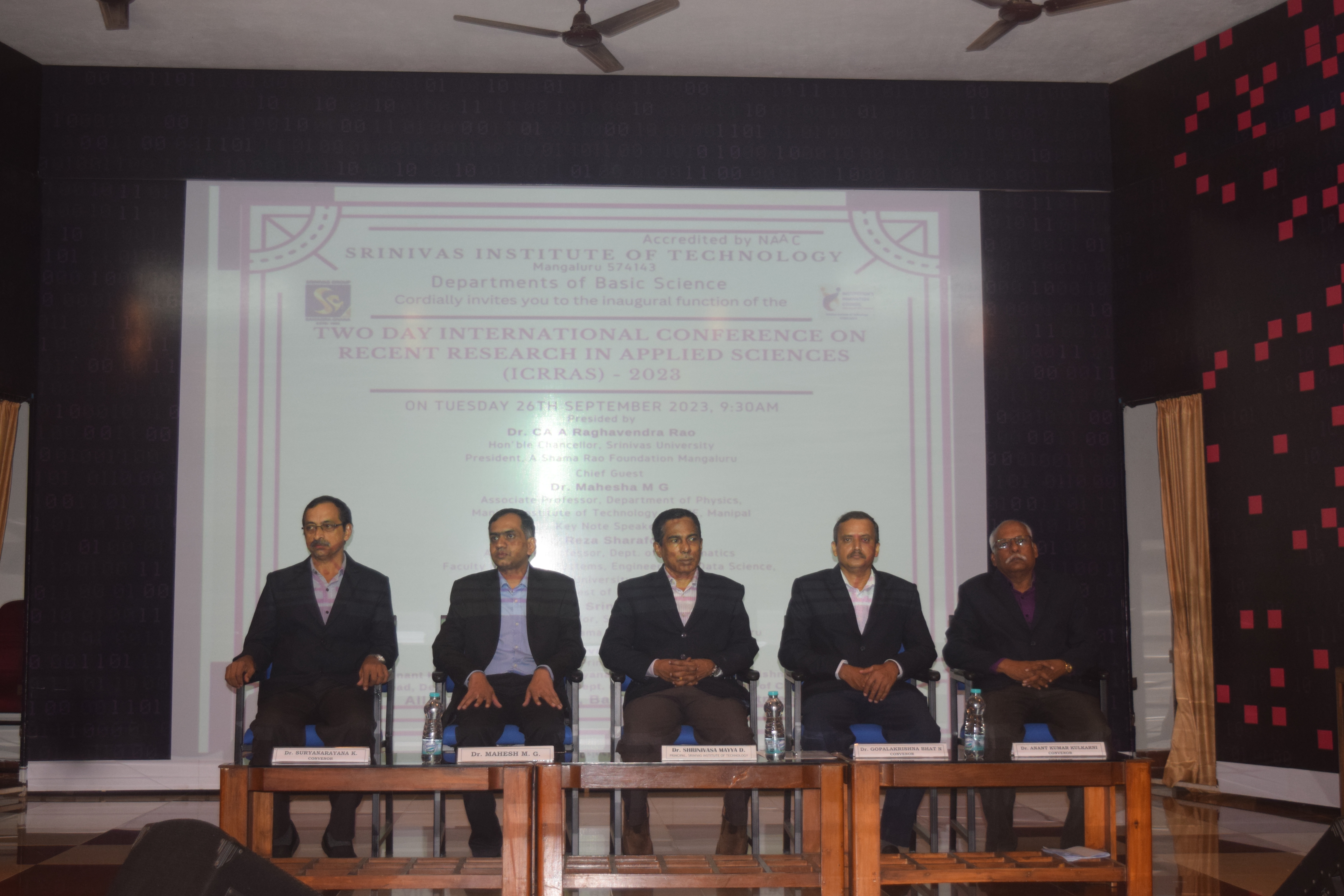 An International Conference on “Recent Research in Applied Sciences [ICRRAS-2023]” was organized by the Departments of Basic Science on 26th and 27th September 2023 at Srinivas Institute of Technology, Mangaluru. The conference proceeded with plenary talk by three eminent scientists as the key note address which is followed by paper presentation by the delegates. On 27th September 2023 valedictory programme of the two day conference being conducted