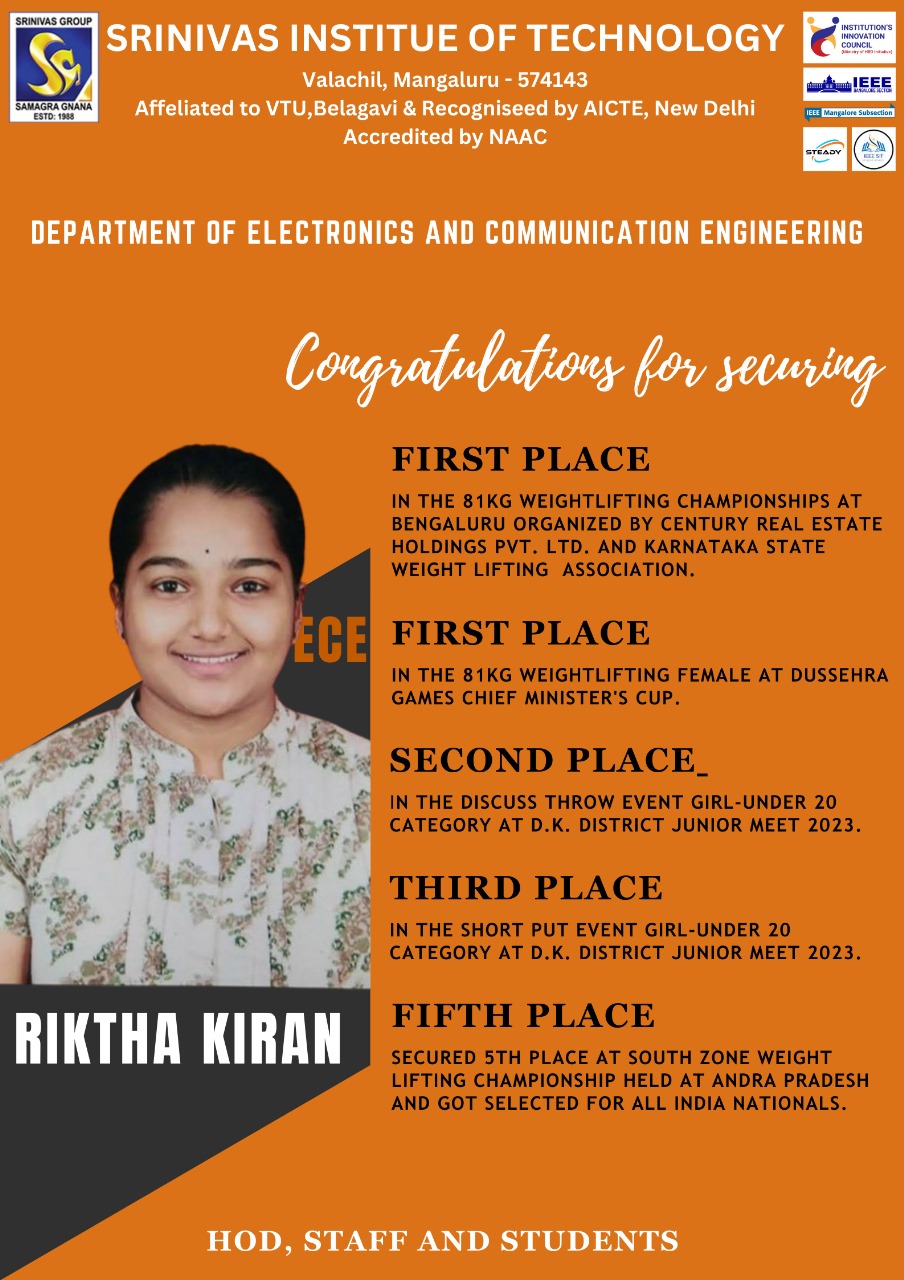 We are thrilled to extend our warmest congratulations to you on your exceptional achievements in various athletic events. Your dedication, hard work, and outstanding performance have truly set you apart. Your recent triumphs are a testament to your talent and relentless pursuit of excellence.Here is a summary of your remarkable achievements Weightlifting Competition at Vemana Institute of Technology 2nd and 3rd September 2023.Achievement.