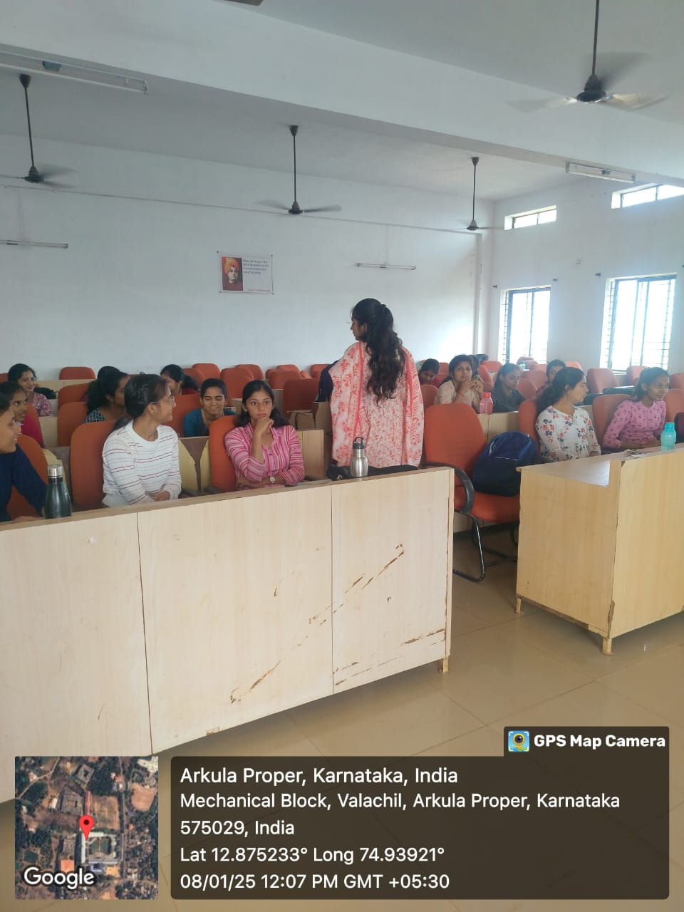 The Department of MCA, in association with Women’s Cell, organized a session on Women’s Health and Wellness on January 8, 2025. Led by Ms. Nikshitha R S, the event focused on menstrual hygiene, mental well-being, nutrition, and stress management.