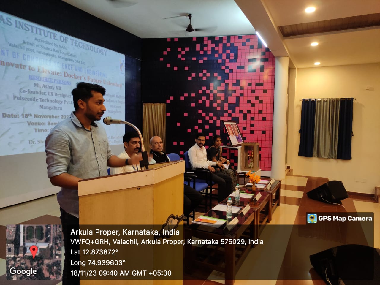 A One-day workshop on Innovate to Elevate: Docker's Future Unleashed was inaugurated at Srinivas Institute of Technology, Mangaluru on 18th November 2023. The workshop was organized by the Department of Computer Science and Engineering in association with Institution Innovation Council (IIC).Dr. Shrinivasa Mayya D, Principal of the College urged the students to get the maximum benefits from this workshop. Dr. Ramakrishna N Hegde, Convenor, Institution Innovation Council (IIC), in his inaugural address spoke about the significance of innovation in the field of engineering motivated the students to make use of such platform and incorporate in their carrier. Mr. Diksheeth Rajkumar, Senior software engineer, Unicourt, Mangaluru the resource person, stressed the need of Docker platform and the importance of emerging technologies in academics. Mr. Dikshith N S, Firmware Engineer, Itron Inc, Bengaluru urged the students to be more focused on the current requirements of software industries. Mr. Ashay V B, Co-founder, UX Designer at Pulsecode Technology Pvt. Ltd, Mangaluru, motivated the students to be successful entrepreneur using Docker platform which is the current trend in the market. Prof. Ravishankara K, Head of Computer Science Department appreciated Institution Innovation Council (IIC) for this event that nurtures technical skills and provide knowledge on emerging technologies.Prof. Guruprasanna J K welcomed the gatherings and Prof. Harishma K V delivered the vote of thanks. Ms. Pooja and Ms. Shivani compered the entire event. A Handson training session was conducted after the formal function. More than 100 students actively participated in this workshop.