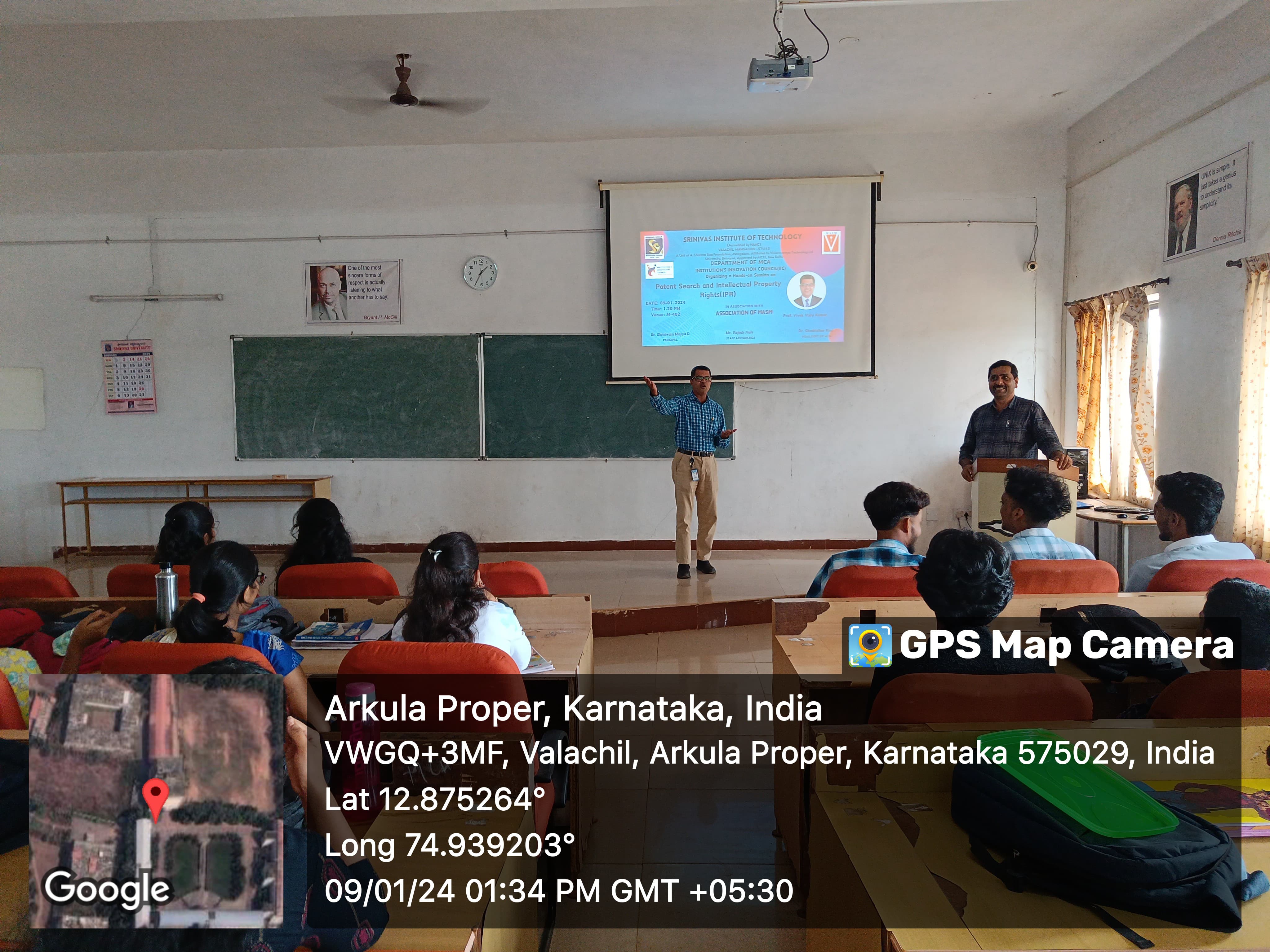 The MCA Department at Srinivas Institute of Technology organized a Guest Lecture on Intellectual Property Rights on January 9th, featuring distinguished speakers including Dr. Shashidhar Kini K, Prof. Vivek V Kumar, and Mr. Rajesh Naik.Dr. Shashidhar Kini K, HOD of MCA Department, extended a warm welcome to the esteemed guests, teaching and non-teaching staff, and students.Prof. Vivek V Kumar delivered a comprehensive session, highlighting key concepts of Intellectual Property Rights (IPR). His expertise covered patents, trademarks, copyrights, and trade secrets, providing real-world applications and emphasizing their importance.The lecture included practical examples, such as the significance of copyrights in music and social platforms. Prof. Vivek V Kumar elucidated the process of protecting ideas, works, and inventions. The example of Coca Cola Company having around 8000 patents added practical insights.Students actively participated in discussions on the influence of small innovations on societies and the role of IPR in fostering creativity. The importance of innovating and patenting ideas for societal benefit was emphasized.The event concluded with Dr. Shashidhar Kini K presenting a memento to Prof. Vivek V Kumar, acknowledging his valuable contribution to the lecture.