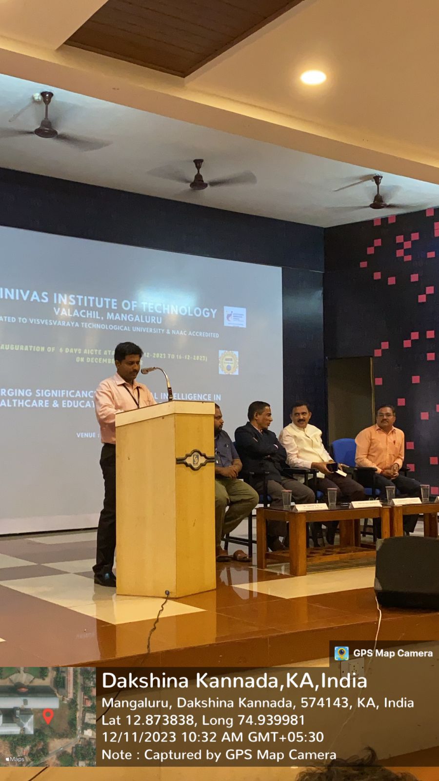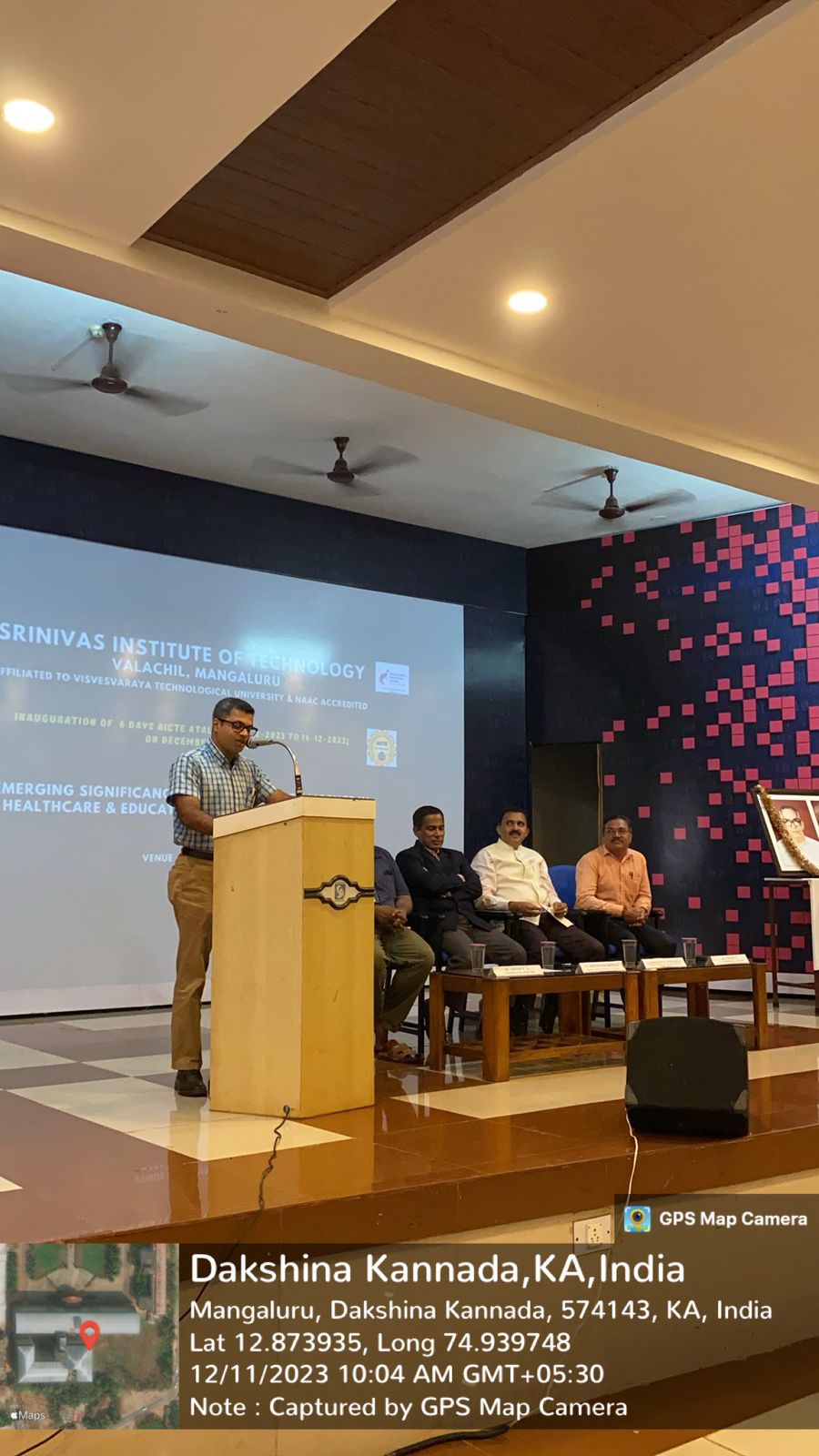 The inauguration of the ATAL Faculty Development Program (FDP) on the Emerging Significance of Artificial Intelligence in Health Care and Education, Current Perspectives took place on 11th December 2023 at Srinivas Institute of Technology, Mangaluru. The event commenced with a prayer led by Yashmitha and her team, followed by the traditional lighting of the lamp.Chief Guest Address Dr. Ramakrishna Shabraya, the esteemed Principal of Srinivas College of Pharmacy, served as the chief guest for the occasion. In his address, he delved into the growing impact of Artificial Intelligence in the fields of health care and education. His insights provided a valuable perspective on the current trends and future possibilities in these domains. Dr. Srinivasa Mayya D, the President of the ceremony and Principal of Srinvas Institute of Technology, emphasized the transformative potential of Artificial Intelligence in shaping the future of education and healthcare. His address highlighted the importance of staying abreast of technological advancements for educators and healthcare professionals alike.Dr. Anoop B K and Dr. Prasad P, the coordinators of the ATAL FDP, introduced the program, outlining its objectives and the specific focus on Artificial Intelligence. They provided an overview of the upcoming sessions, emphasizing the practical insights participants could gain.Prof. Vivek Kumar, in his welcome speech, set the tone for the FDP by underlining the critical role of Artificial Intelligence in the contemporary landscape of education and healthcare. He expressed gratitude to the participants guests and organizers for their involvement in this pioneering initiative.Prof. Parvathraj K M M conveyed sincere thanks to all attendees collaborators and sponsors who contributed to the success of the inauguration. His words of appreciation acknowledged the collective effort invested in making the event possible.The inauguration ceremony not only marked the commencement of the ATAL FDP but also served as a platform to explore the dynamic intersections of Artificial Intelligence in healthcare and education. As the program unfolds, participants are anticipated to gain valuable insights and skills, fostering innovation and progress in their respective fields.