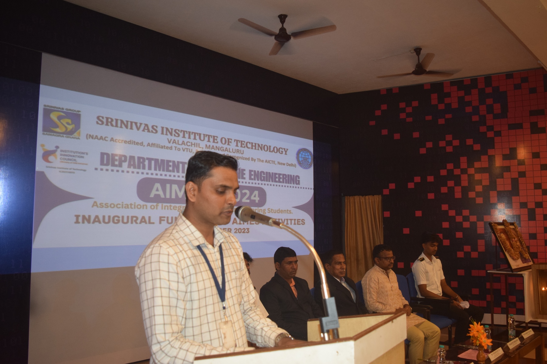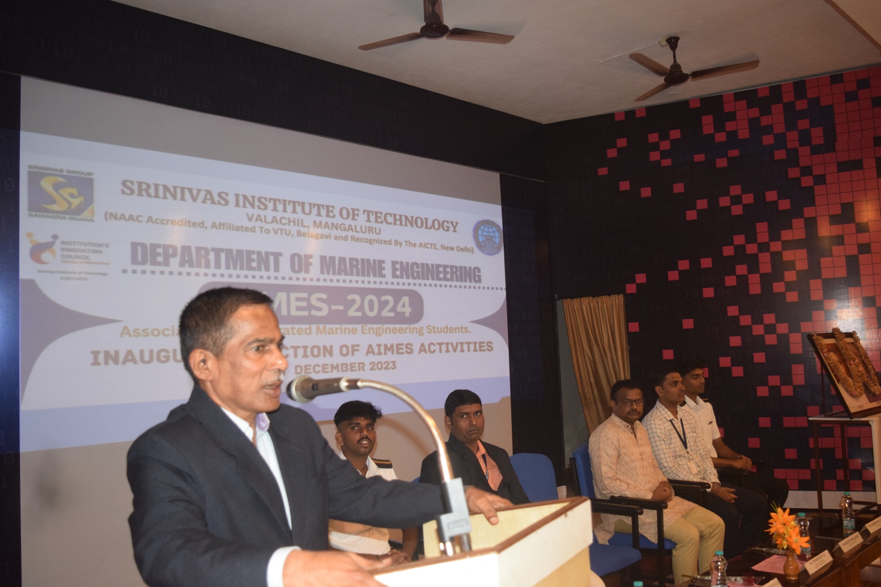 The Inaugural function of Marine Student Association AIMES-2023-24 was held on 8th December 2023 at Srinivas Institute of Technology, Valachil, Mangaluru. Mr. Prasenjit T S, alumnus and PMS Data Administrator at Apollo Ship Management Pte.Ltd was the chief guest for the function. The function was presided by Dr. Shrinivasa Mayya D, Principal of Srinivas Institute of Technology.Dr. Shrinivasa Mayya D highlighted the seamless integration of Information Technology into the maritime field, underscoring the abundant opportunities available for marine engineers. He expressed delight in sharing the stage with a distinguished alumnus and commended the student association's pre-inaugural activities, urging students to actively participate. The esteemed chief guest emphasized the applicability of marine engineering knowledge in securing IT positions within the marine sector and assured ongoing support for students. He expressed gratitude to the organizers for extending the invitation.Dr. Lokesh V, Head of Marine Engineering, encouraged students to use college resources efficiently for smooth event planning. He thanked the distinguished guests for taking the time to attend despite busy schedules. Dr. Lokesh V stressed the importance of connecting with industry professionals, emphasizing that events like these provide valuable opportunities for students to engage with experts in their fields.Dr. Shankar KS, Head of the Mechanical Engineering Department, Dr. Dheeraj Hebri, Head of the Training & Placement Department, along with faculty members from various departments, witnessed the function. The program was coordinated by Prof. Sunil Prakash R, AIMES Faculty Advisor. Mr. Karthik H K, AIMES President welcomed the gathering. Mr. Haroon M Nadaf, AIMES Secretary delivered vote of thanks. Mr. Prithuesh P B, 5th Semester Marine Engineering, introduced the chief guest. Ms. Nithya M R and Mr. Jude A James, 7th Semester Marine Engineering, were the masters of ceremony.