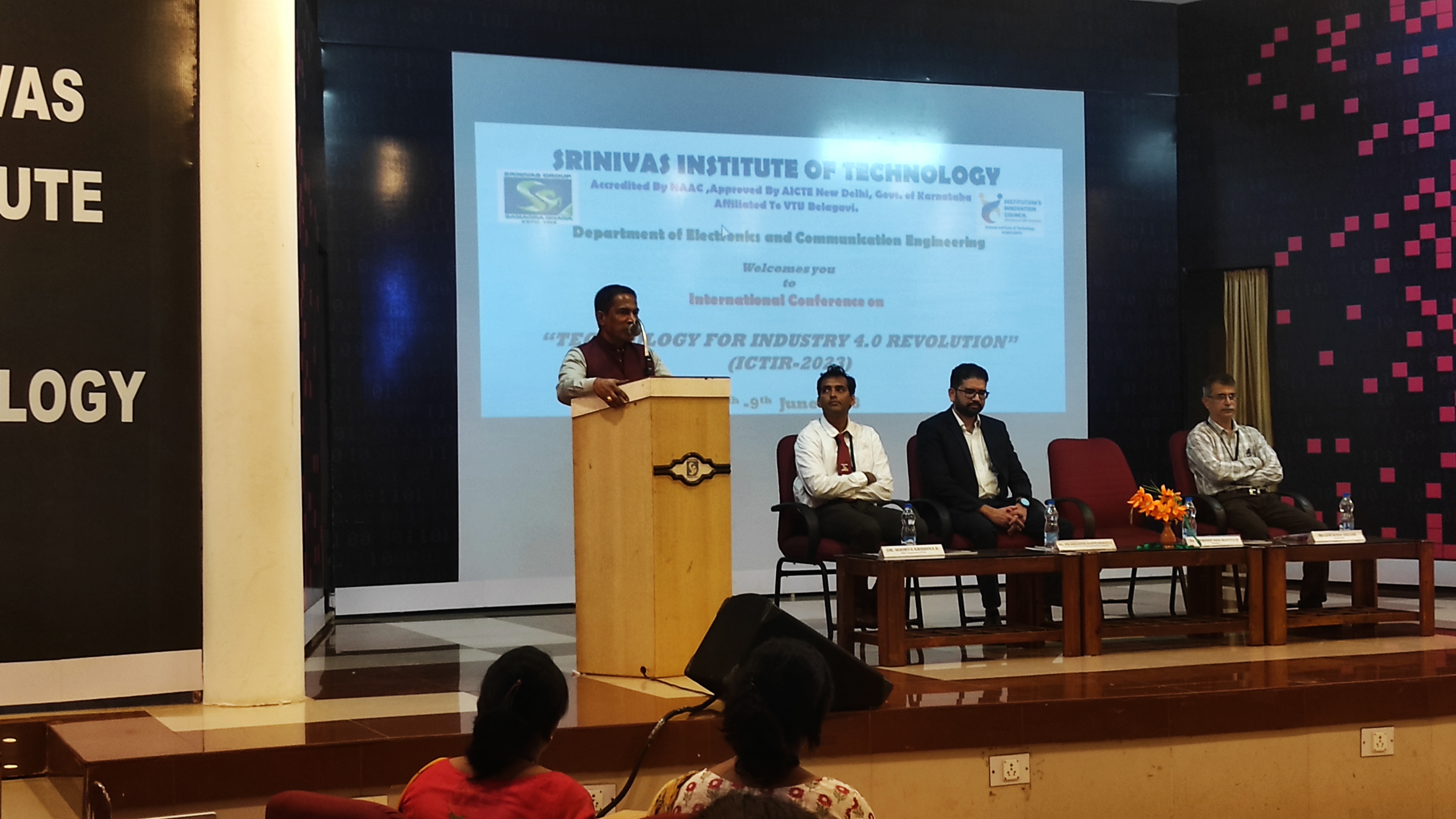 The International Conference on Technology for Industry 4.0 Revolution (ICTIR - 2023) organized by the Department of Electronics and Communication Engineering took place on June 8-9, 2023, at the AC Seminar Hall. The President of the function, Dr. Shrinivas Mayya D, Principal of Srinivas Institute of Technology, Mangalore, inaugurated the conference by lighting the lamp on June 8, 2023. In his address, he emphasized the importance of the international conference in helping students refine their skills and abilities, indicating the value of such events in fostering their growth.Mr. Prashanth Kannadaguli from Dharini Academy served as the chief guest of the function. In his speech, he urged the students to stay updated with the latest trends in technology, recognizing the significance of being aware of emerging developments in the field.Dr. Soorya Krishna K, the Head of the Department (H.O.D) of Electronics and Communication Engineering, welcomed the gathering and introduced the chief guest, Mr. Prashanth Kannadaguli. Mr. Gourish S Hegde provided a brief overview of ICTIR-2023, giving attendees a glimpse into the conference's objectives, themes, and significance. Mrs. Marina Chandy and Mrs. Sahana Girish served as the Masters of Ceremony (MCs) for the program, guiding the proceedings and ensuring the smooth conduct of the event.The conference featured two keynote addresses. Mr. Prashanth Kannadaguli delivered the first keynote address on The Machine Learning Process. His speech covered the principles, techniques, and applications of machine learning within the context of Industry 4.0.The second keynote address was given by Dr. Vivek from the University of Technology and Applied Science in the Sultanate of Oman. He spoke on the topic of Transforming Distributed Sensor Networks with Compressive Sensing. In total, the conference featured 25 paper presentations from various engineering colleges. These papers likely covered a wide range of topics related to Industry 4.0, including technologies, applications, research findings, and innovative solutions proposed by participants from different institutions.