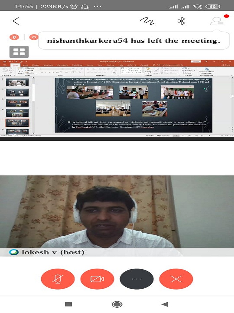 The Valedictory function of the activity of the ASMA, the students’ association of Mechanical Engineering Department and Institute of Engineers India student chapter, Srinivas Institute Technology for the year 2019-20 was held on 14th August 2020 by using online platform. Dr. Shrinivasa Mayya D., Principal of the college and President of the function congratulated the members of the association and advised the students to think positive whatever may be the situation arise and make use of this pandemic situation for innovation. Students should make use of this free time for their personal development skills and also in learning new things because learning never stops. Speaking on the occasion Dr. Shankar K S, Head of the Department of Mechanical Engineering gave complete scenario of technical education now a days and stressed the need of Mechanical Engineers and also said about Mechanical Engineers should not only focus on core area but also to inter-displinary areas. Faculty advisor of ASMA Prof. Lokesh V briefed about the annual report of ASMA. Faculty advisor of IE(I) Prof. Sathish KG compered the program. The program was welcomed by Mr. Swasthik, and Mr.Daivik Bangera delivered vote of thanks