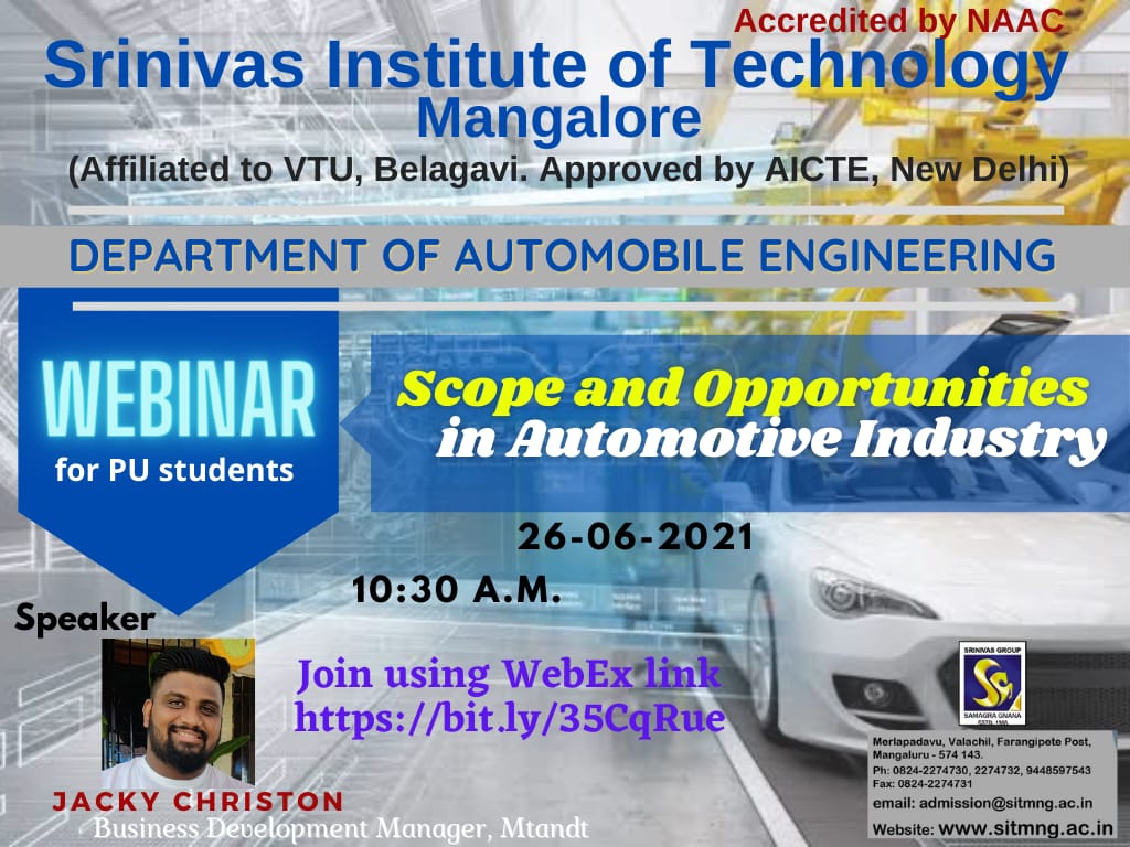 Department of Automobile Engineering, Srinivas Institute of Technology, Mangaluru organized a Webinar on “Scope and opportunities in Automotive Industry” on June 26, 2021, for the benefit of the aspiring PU students to explore the option of choosing the Automobile Engineering UG program and the UG students of the department. Mr Jacky Christon, Business Development Manager, MT & T, proud alumni of the department was the speaker. Speaking on the occasion Mr Jacky Christon explained the importance and opportunities for Automobile Engineering Graduates in the changing Technolgy scenario. Dr Ramakrishna N. Hegde, Head of Automobile Engineering, addressed the students with his motivational talk, he mentioned that Automobile engineering is the basic and key branch compared to other branches offering good career growth in the next two to three years to come. Dr Shrinivasa Mayya D., Principal, Srinivas Institute of Technology, Mangaluru was present in this webinar. Master of the ceremony was done by Ms Spandana P, student of 8th sem Automobile Engineering. The event was coordinated by Mr Jerome Anthony, faculty advisor of the Automobile Department and Mr Shashank, Coordinator, Placement Department. More than 75 students were present for this webinar. The webinar was completed with the support of faculties of the Automobile Department, HOD, Principal and the Management.