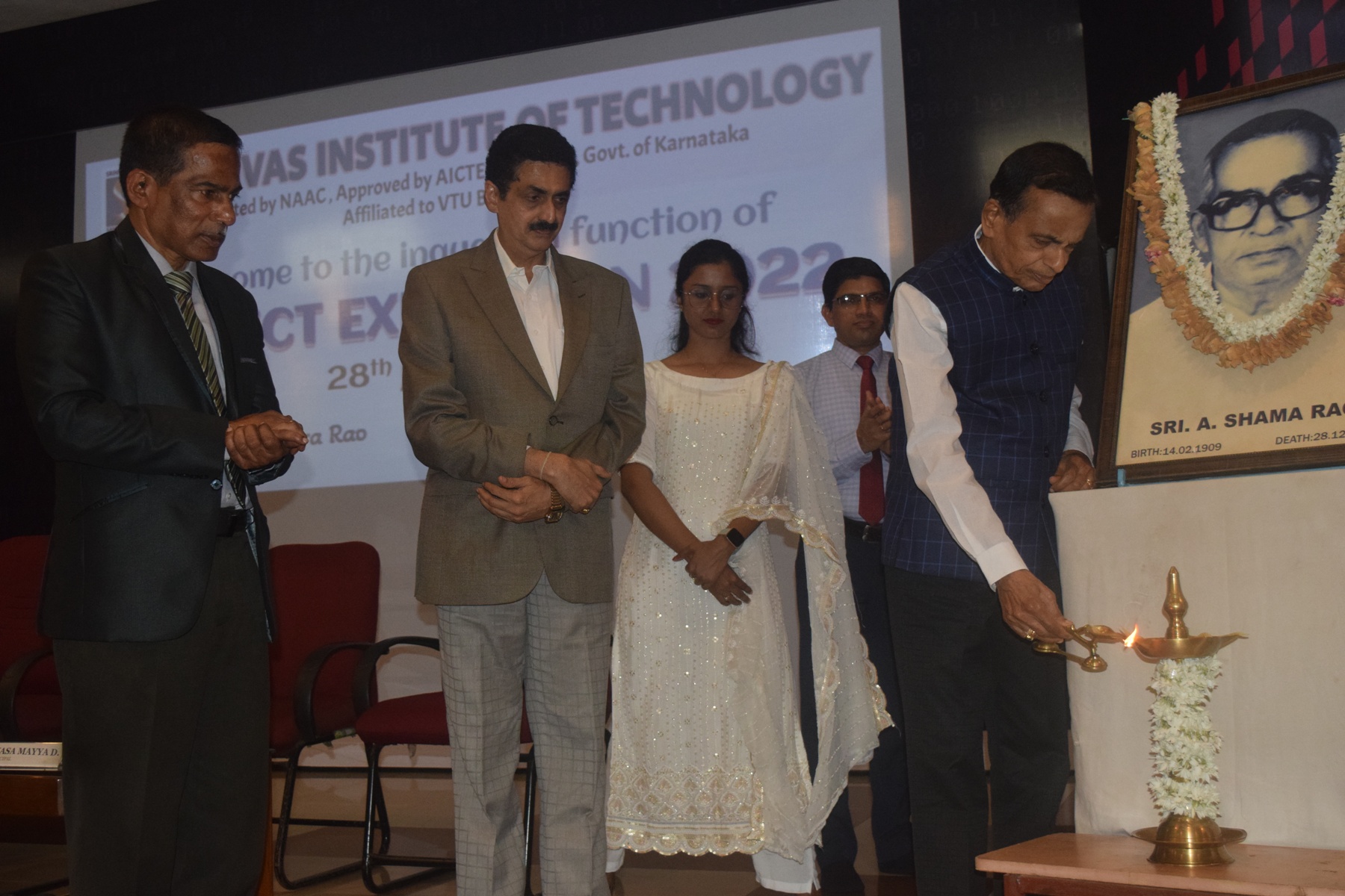 Inauguration of Student Project Exhibition– 2022 of Srinivas Institute of Technology, Mangaluru, was held on 28th of June 2022. Dr. CA A. Raghavendra Rao, Chancellor, Srinivas University and president of A Shama Rao Foundation presided over the inaugural function.Ms. Amratha K, Software Engineer, VFI SLK software, Bengaluru, was the chief guest. Dr. A. Srinivas Rao, Pro Chancellor, Srinivas University and Vice-President of A Shama Rao Foundation was the Guest of Honor. The dais was shared by Dr. Shrinivasa Mayya D., Principal, Srinivas Institute of Technology and Dr. Shankar K.S, Convener of the Projectexhibition.The chief guest Ms. Amratha K addressed the students with her motivational talk, mentioned that, students must involve in the project completely and should have a deep knowledge about their project. She also explained what the industries can expect from the student projects and challenges involved in corporate world. Dr. CA A. Raghavendra Rao, in his presidential address, mentioned the importance of teacher’s guidance and role of all the branchesof engineering in creation of a new technology. Dr. A. Srinivas Rao, mentioned the role of engineers in various field including health sector. Also he encouraged the students to develop the projects into useful products for public and apply for the patents.Dr. Shankar K. S. the convener of the project exhibition briefed about the project exhibition 2021-22. A total of 99 projects in all departments will be on display, out of which 10 are sponsored by Karnataka State Council for Science& Technology (KSCST) Bengaluru and 16 are sponsored by VTU Belagavi. All the projects will be judged by internal and external experts. The best projects will be awarded with cash prizes.The inaugural function was started with invocation by Ms. Pallavi, from department of Electronics and Communication. Mr. Sai Prasad from department of Marine Engineering, welcomed the gathering. The chief guest was introduced by Ms. Vandana, from department of Electronics and Communication. Mr. Jibin TV, from department of AIML delivered the vote of thanks. Ms. Smrithi BS from department of Marine Engineering was the master of ceremonies.