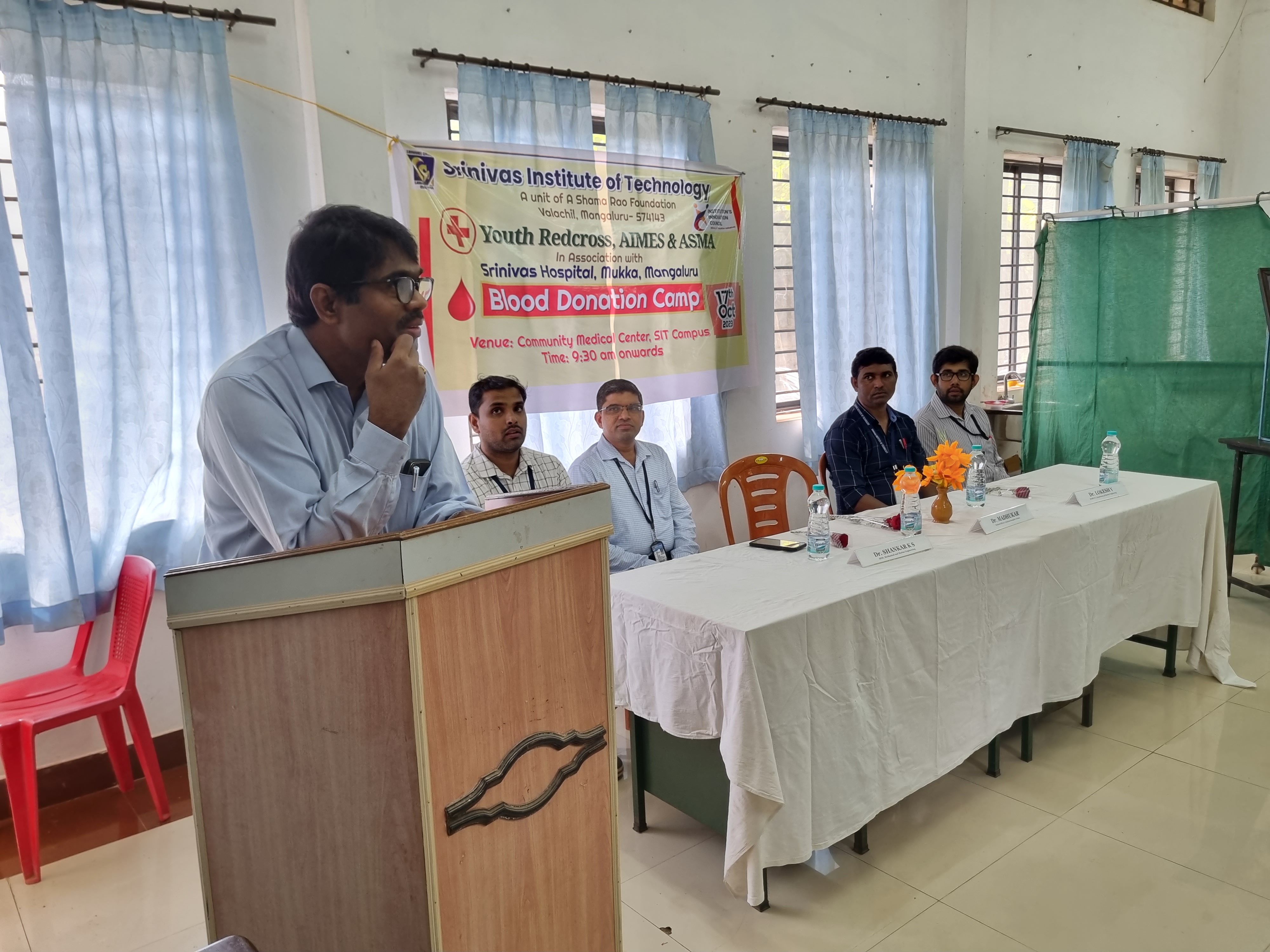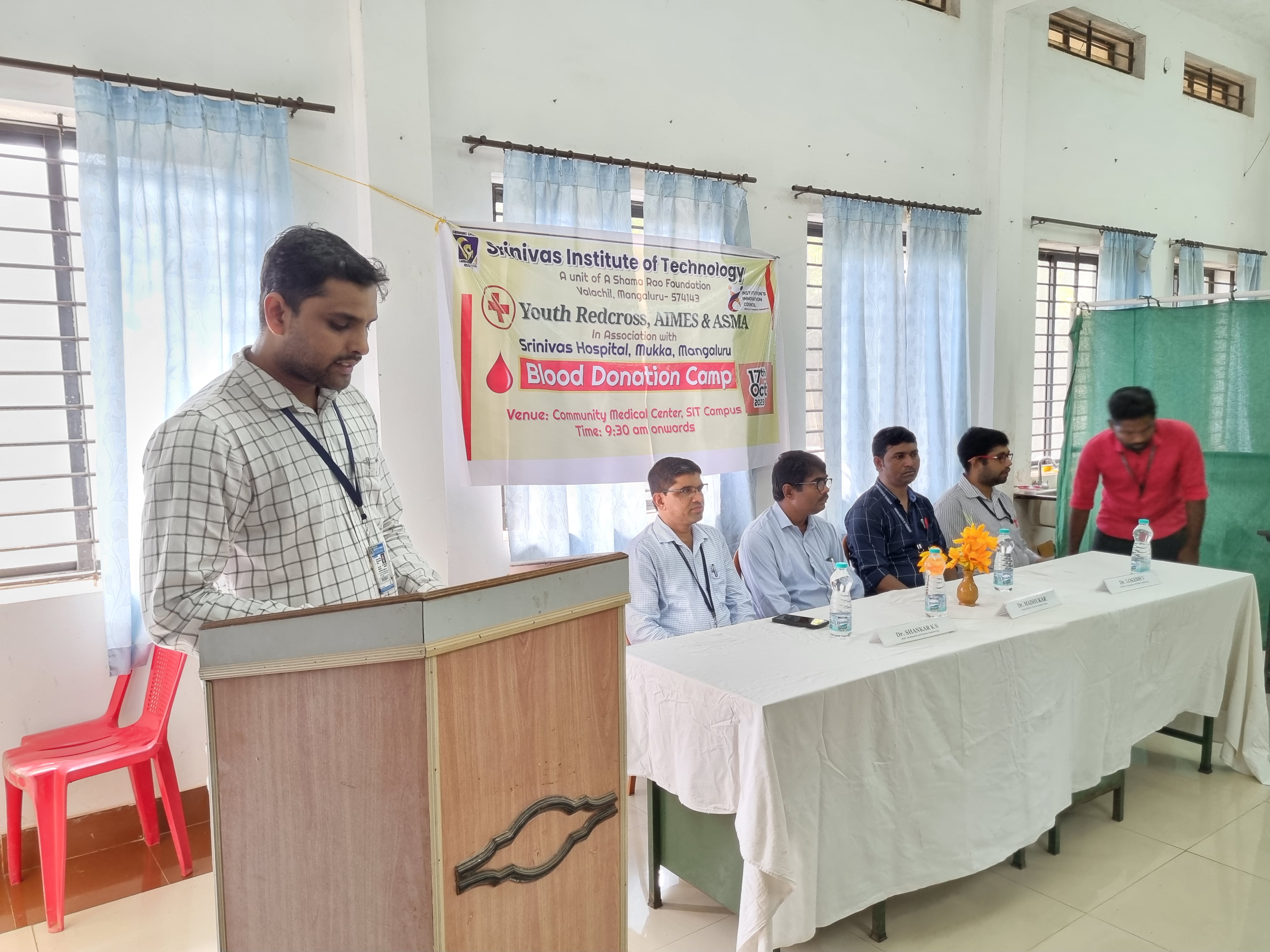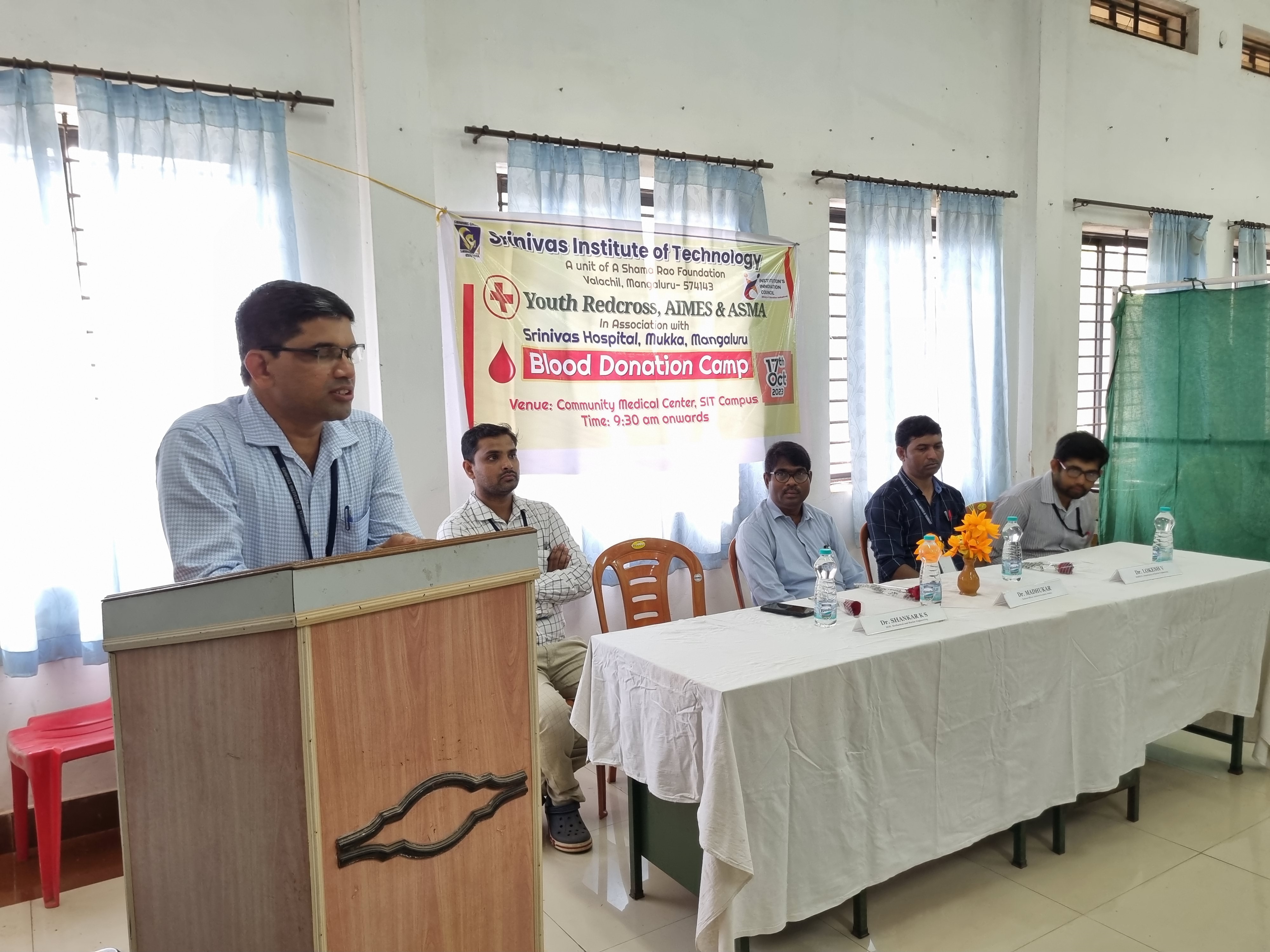 A blood donation camp was jointly organized by AIMES (The student association of the Department of Marine Engineering), ASMA (The student association of the Department of Mechanical Engineering), and Youth Red Cross-SIT at Srinivas Institute of Technology, Mangaluru, in collaboration with Srinivas Hospital, Mukka on October 17, 2023. The event received active participation from students and staff, resulting in the collection of 48 units of blood. The camp commenced at 09:30 AM with a brief inaugural function presided over by Dr. Shankar K S, the Head of the Mechanical Engineering Department at SIT Mangaluru. Dr. Madhukar, the Medical Officer at Srinivas Hospital Mukka, graced the event as the Chief Guest.Dr. Madhukar delivered a comprehensive address to the students, emphasizing the critical significance of blood donation in meeting emergency blood requirements. He underscored the profound impact of a single blood donation, equating it to the potential to save three lives. Additionally, he provided insight into the essential physical criteria for blood donation and wholeheartedly encouraged all attendees to voluntarily contribute to this noble cause.During his address, Dr. Shankar K S highlighted the significance of blood donation as an integral aspect of student social service. He commended the diligent efforts of AIMES and ASMA members, expressing his pride in the college's successful execution of the blood donation initiative. Dr. Shankar also extended his appreciation to the Srinivas Hospital, Mukka team for their invaluable support and provision of facilities. Dr. Lokesh V, HOD Marine Engineering, Prof Sunil Praksah R, AIMES faculty coordinator, Prof. Sathyapraksah A, ASMA faculty coordinator and faculty members were present on this occasion. Prof Sunil Praksah R welcomed the gathering, vote of thanks was given by Mr. Nishanth, 7th Semester Marine Engineering, Mr. Jude James from 7th semester Marine Engineering was the master of ceremonies.