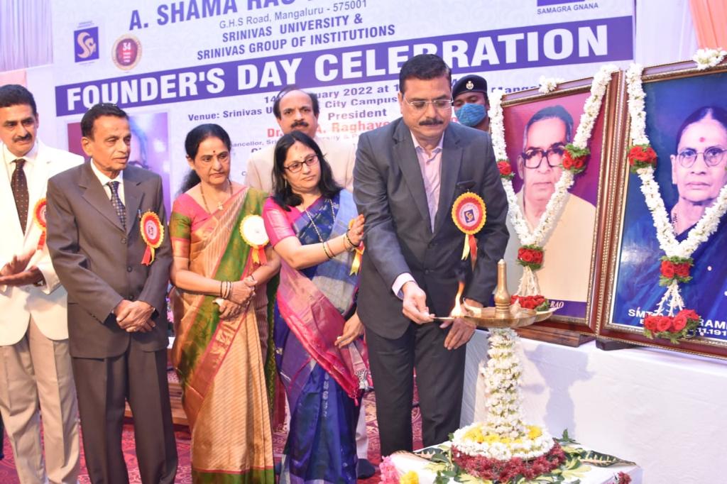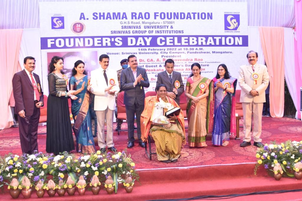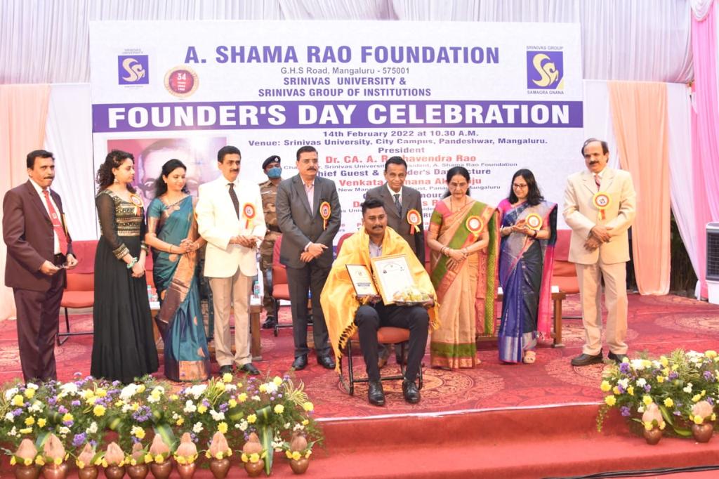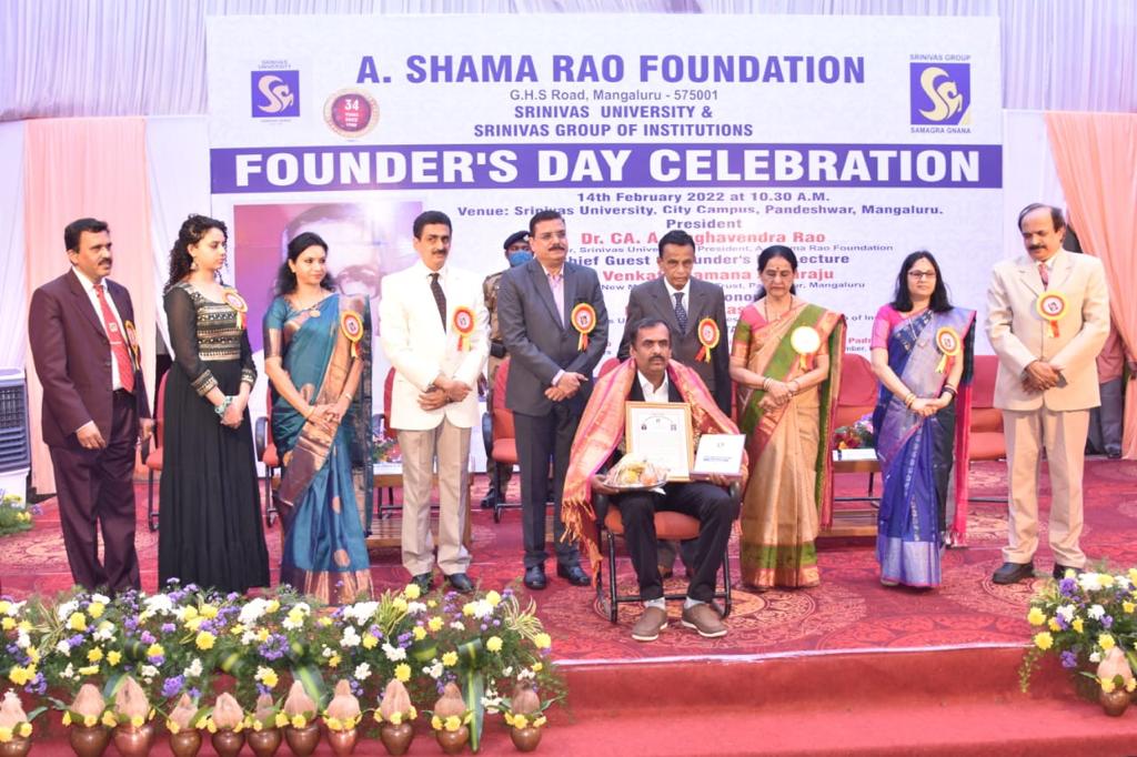 Founder's Day celebration of Srinivas University was organised on 14 February 2022 at Srinivas College Quadrangle, Pandeshwara Campus. Dr Venkata Ramana Akkaraju, Hon'ble Chairman of New Mangalore Port Trust was the Chief Guest of the program. Dr CA A Raghavendra Rao, Hon'ble Chancellor of Srinivas University and President of A Shama Rao Foundation Mangaluru presided over the program. Dr A Srinivas Rao (Hon'ble Pro Chancellor, Srinivas University and Vice President of Srinivas Group of Institutions), Smt A Vijayalakshmi R Rao (Trustee-Member, Board of Governors, Srinivas University), Prof Er Smt A Mitra S Rao (Trustee-Member, Board of Governors, Srinivas University), Dr P S Aithal (Vice Chancellor), Dr Sushma Kesari and Kumari Meghana were present on the dais. Pro Chancellor of Srinivas University, Dr A Srinivas Rao Ji delivered the welcome address. Dr Srinivas Rao briefed the glory of Srinivas University since its inception and the various milestones achieved. Dr Anil Kumar paid homage to the founder Shri A Shama Rao on the occasion of 113th Birth Anniversary. Dr Anil Kumar has given a bird's eye view of Srinivas University. Dr Anil Kumar said that more than twelve thousand students are studying in 82 different programmes at three campuses and around four thousand faculty and staff members are serving the University. In his inaugural address, Dr Venkata Ramana Akkaraju quoted the sayings of renowned Telugu Poetess Sumati and said that Parents will feel proud and satisfied when their Children become Able and Nobel person in the society, achieve success in their life and the glory of success is carry forwarded by the next generation. Dr Venkata Ramana Akkaraju said: Our Dr Raghavendra Rao Ji, because of his hard work, because of his dedication, has made an institute with 7 people from scratch to a State Level Private University. There is a need to reduce the gap between Institute and Industry. Srinivas University is working in this direction which is commendable and this University will become a world class university. Vidya dadaati Vinayam, i.e. Education gives obedience, and this obedience makes you eligible, this eligibility (ability) facilitates you to earn money and success. Once you earn money by following Dharma, definitely you will contribute it to the society and this will give you peace of mind. Every one of us should recognize what is our accountability to the society, and how best we can contribute to the upliftment of the society. Students should inculcate 5 qualities, namely, Kakacheshta, Bakodhyana, Shwana Nidra, Mitahaari and Brahatyagi, in order to get success in their life. Teachers also have responsibilities, they should have interest in what they teach, should know how to teach, how to make it interesting, and should be a role model for the students. Qualities of good students and Expectations of good teachers, both coupled together will solve almost 90% problems in an educational institution. India is a country with 137 crore population with different cultures and languages, but still we are all one, we believe in Unity in Diversity. Our country is fundamentally dependent on democracy, our constitution. Education institutes play an important role in making children the responsible and good citizens of this nation. Contribute your earnings to the society in the form of charity, either in the form of education or healthcare. Try to become entrepreneurs. Think with innovation, and work to Make India competitive. Knowledge, Creativity and Courage will make you a world class citizen. India is a land of sandalwood, land of greetings, land of delivery, land of gratification, we live here, this is our Karma Bhoomi. Let’s work hard, not only for ourselves, let’s work for the society, let’s work for the people around, let’s work for our State and Nation with our innovation, dedication, knowledge, entrepreneurship and with our hard work. Let’s make the dream of our Hon’ble Prime Minister Shri Narendra Bhai Modi Ji to reach a 6 trillion dollars economy by 2025. In his Presidential remarks, Hon’ble Chancellor of Srinivas University, Dr CA A Raghavendra Rao Ji said that with the vision of Jagte Raho Bharat and Udte Raho Bharat, we all should work for the Nation. Dr Raghavendra Rao said, one of the greatest charities is Vidya Dana. We are providing knowledge and skills development training to all the students of Srinivas University to ensure better employment. In this direction, the Center of Excellence has been set up to provide skill development training programmes at the Engineering College campus in Mukka. Srinivas University is a mini India. There are students from all the states of India. We have started MBA programmes in a number of disciplines, in order to promote the people who are serving in private and public sector organisations. Dr Raghavendra Rao Ji said that the curriculum in Srinivas University will be updated in each academic year and in each semester, to compete with changing technology in the industry. On this occasion, Shri Ramananda (Hindi Language Teacher, Govt English Medium High School, Daddal Kadu, Bantwala) and Dr Saroja M (Lecturer in Biology, Bhandarkar's PU College, Kundapura) were felicitated with A Shama Rao Memorial Outstanding Teacher Award 2021-22 for their contribution in the field of Education in the undivided Dakshina Kannada district. Smt C S Radhika (Female Ambulance Driver, Cauvery Ambulances, Kulai) and Shri Varun Alva (Asst Sub Inspector, Reserve Police, Mangaluru) were felicitated with A Shama Rao Memorial Award 2021-22 for their outstanding service in the field of Social Service and Bravery respectively. On this occasion, Dr Sandhya Shenoy of Srinivas University was felicitated for her contribution in the field of Research. Shri Charles K C, Student of Srinivas University was also felicitated for his international recognition in the field of arts and painting. In addition, twelve Ph.D degree awardees and eight gold medal achi