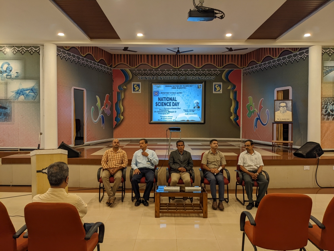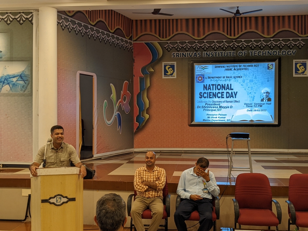National Science Day was organized on 28/02/22 in association with Basic Science Department. Prof. Ramyashree welcomed the gathering. President of the function Dr.Shrivasa Mayya D delivered presidential address by motivating the students and also encouraged students to do more in order to develop skills. Prof.Vivek Vijay Kumar of Marine Department enlightened the students by telling about C.V Raman and his contributions and urged students to implement science in various applications. Dr.Surya Narayana, HOD, Physics Department & Prof. Gopal Krishna, HOD, Chemistry Department were present in the occasion. Faculty and staff members of basic science department conducted a quiz to the students. NSS officer P. Rakesh Mallya thanked the gathering.