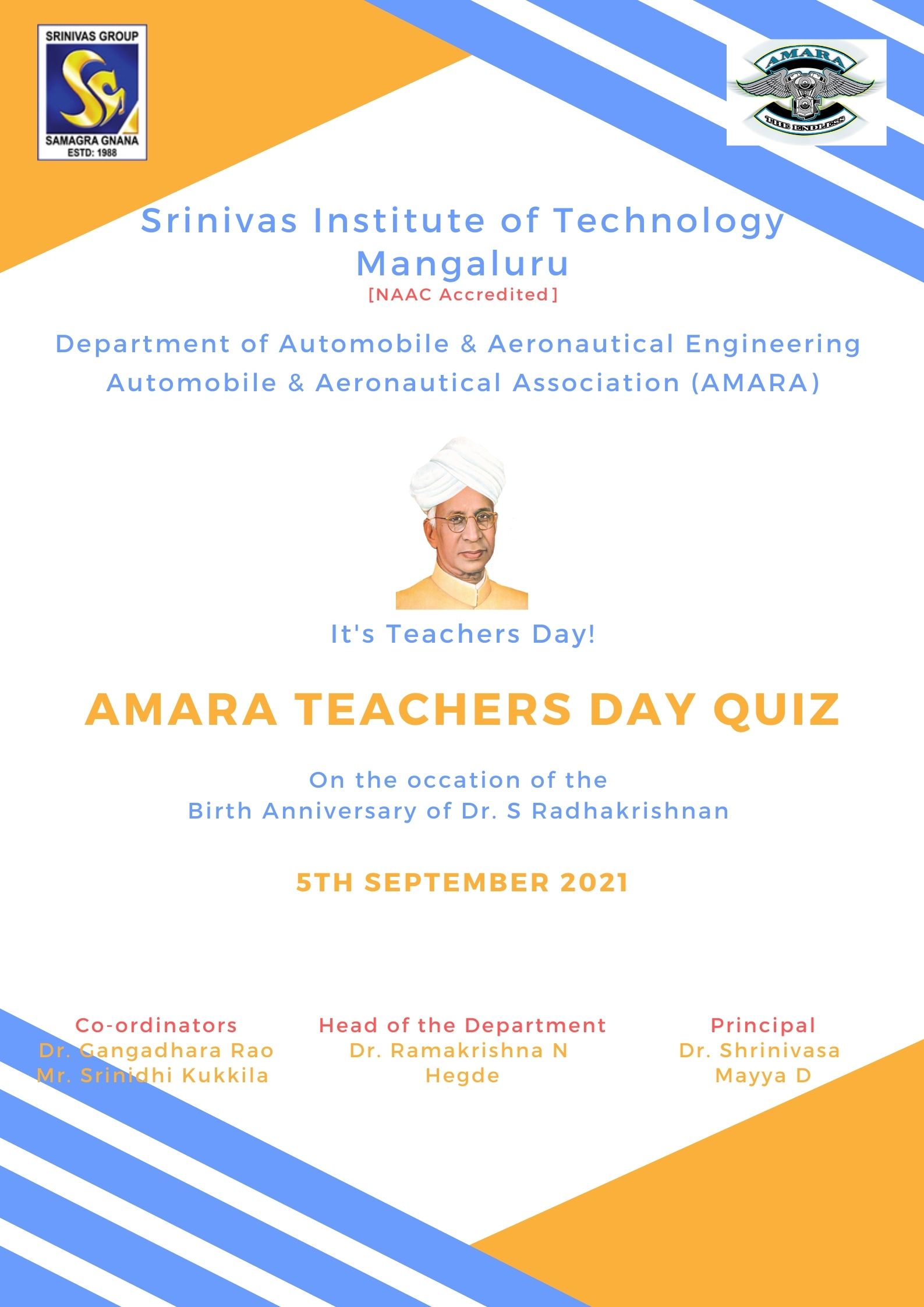 Automobile & Aeronautical Association, AMARA organized a quiz on the occasion of Teachers Day titled “AMARA Teachers Day Quiz” on 7/9/2021. The quiz was conducted on the online platform and a total of 45 Automobile and Aeronautical students participated in the quiz. The quiz was about Dr. S Radhakrishanan and the famous teachers around the world. Congratulations to the Winners!! 1st Place - Yashaswini AS, 7th Semester, Aeronautical Engineering. 2nd Place - Gowthami G, 7th Semester, Aeronautical Engineering. The quiz was conducted by Prof. Srinidhi Kukkila & Dr. Gangadhara Rao under the guidance of Dr. Ramakrishna N. Hegde, Head of the Department and Dr. Shrinivasa Mayya D, Principal, SIT, Mangaluru.