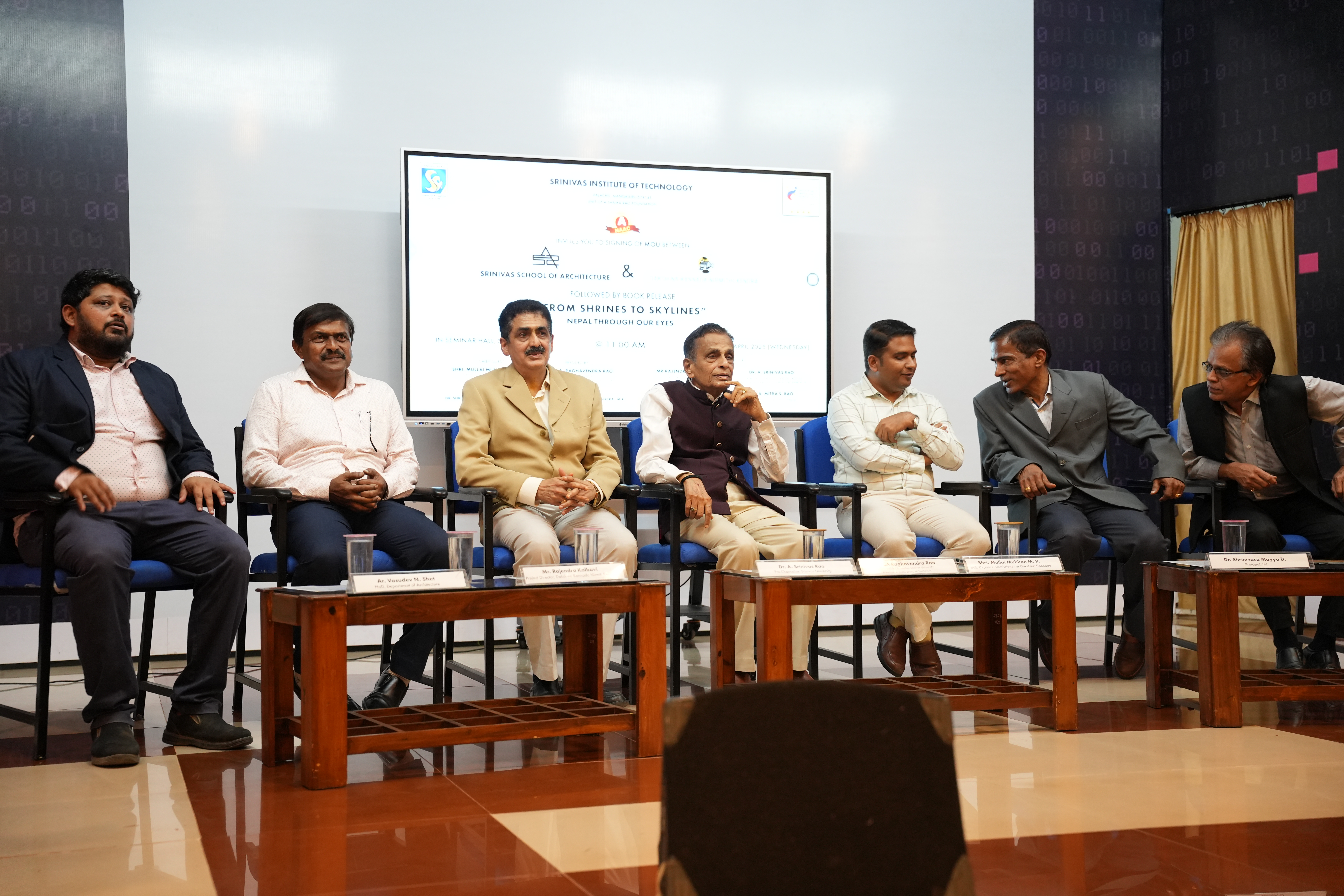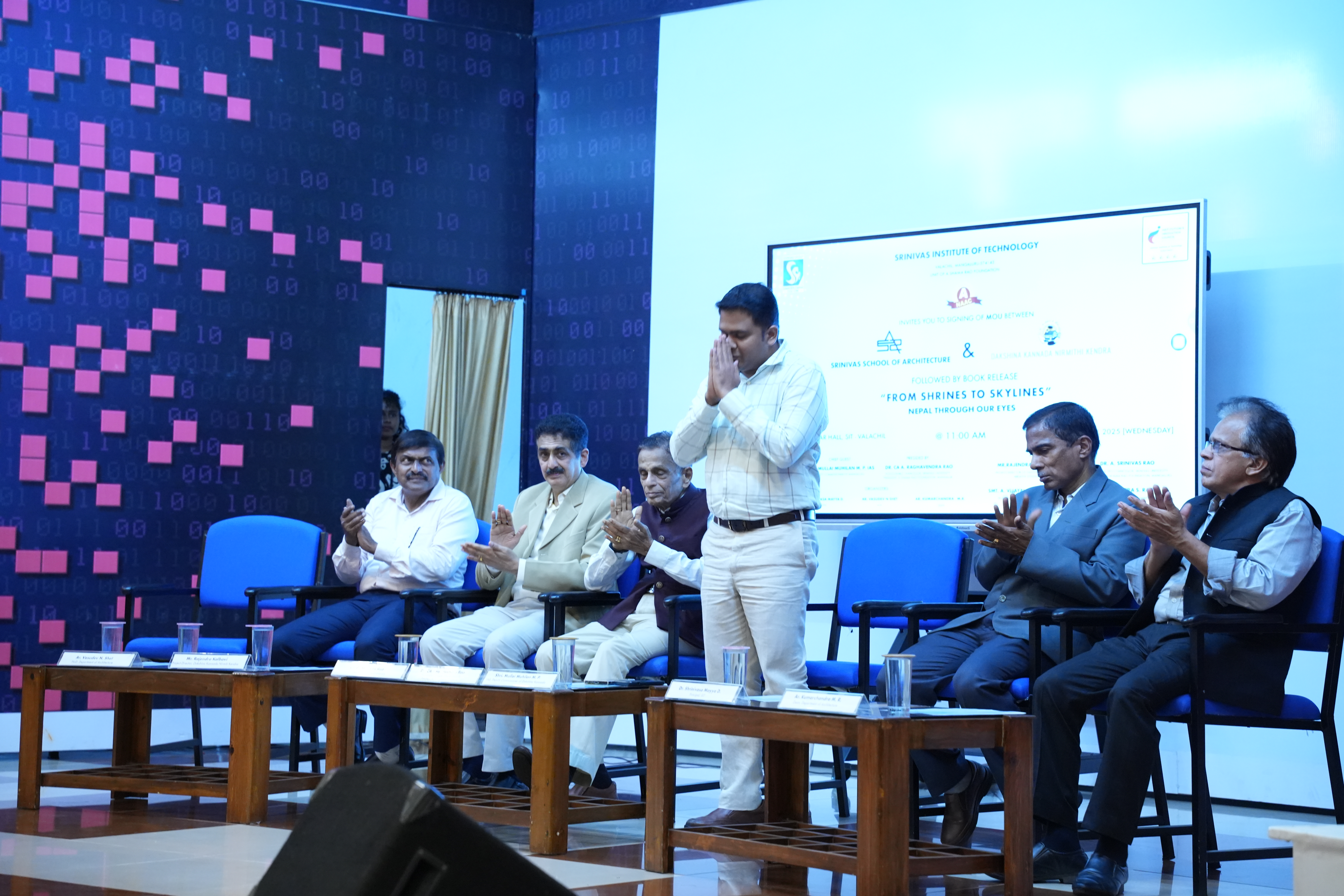 MoU Signing and Travelogue Launch Mark a Grand Event at Srinivas Institute of Technology Mangaluru, April 23, 2025 — A significant milestone was marked at Srinivas Institute of Technology as the institution hosted a distinguished gathering for the signing of a Memorandum of Understanding (MoU) and the launch of an evocative travelogue titled "From Shrine to Skylines: Nepal Through Our Eyes." The event commenced with the arrival of eminent dignitaries including Mr. Mullai Muhilan M.P., IAS, Deputy Commissioner of Dakshina Kannada; Dr. CA A. Raghavendra Rao sir, Chancellor of Srinivas University; Dr. A. Srinivas Rao, Pro Chancellor; and Mr. Rajendra Kalbavi, Executive Director of Nirmithi Kendra. They were cordially received by Dr. Shrinivasa Mayya D., Principal of Srinivas Institute of Technology; Ar. Kumarchandra, Dean; and Ar. Vasudev N. Shet, HoD, Srinivas School of Architecture. After a soulful student-led prayer, Ar. Vasudev N. Shet extended a warm welcome and introduced the esteemed guests. The ceremony progressed with the lighting of the ceremonial lamp, symbolizing the dispelling of ignorance and the ushering in of knowledge. Ar. Leslie Dias took the stage to present an overview of the MoU, underlining its significance in promoting sustainable and affordable construction practices. This was followed by the formal signing of the MoU, reinforcing the institution's commitment to innovative and eco-conscious architecture. The highlight of the event was the launch of the student-curated travelogue "From Shrine to Skylines: Nepal Through Our Eyes," which was unveiled in both physical and digital formats by the Deputy Commissioner. In his address, Mr. Mullai Muhilan M.P. commended the students' remarkable efforts and emphasized the importance of experiential learning, heritage preservation, and sustainability in education. Mr. Rajendra Kalbavi and Dr. Srinivas Rao echoed similar sentiments, stressing the MoU's impact and the use of environmentally friendly materials in the construction sector. Dr. CA .A Raghavendra Rao sir delivered the presidential address, inspiring the audience with his words on vision, innovation, and responsibility in shaping the future of architecture. As a token of respect and appreciation, a felicitation ceremony was held to honor the Deputy Commissioner and Mr. Rajendra Kalbavi. The event concluded with a heartfelt vote of thanks, followed by the rendition of the national anthem and the screening of a captivating student-made documentary on Nepal. This event stands as a testament to Srinivas Institute of Technology's and Srinivas School of Architecture dedication to bridging academia with real-world impact and nurturing globally aware, socially responsible architects of tomorrow.