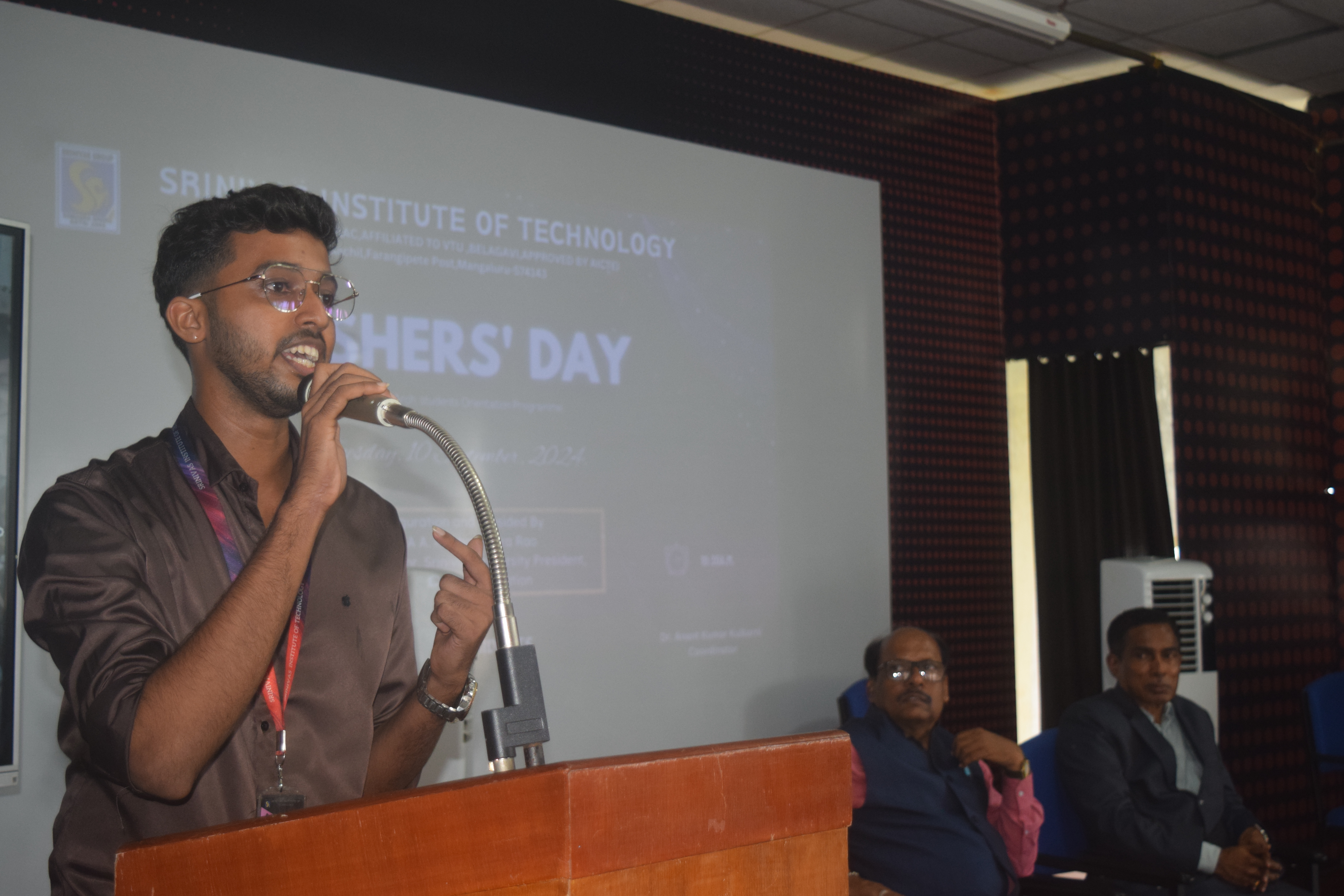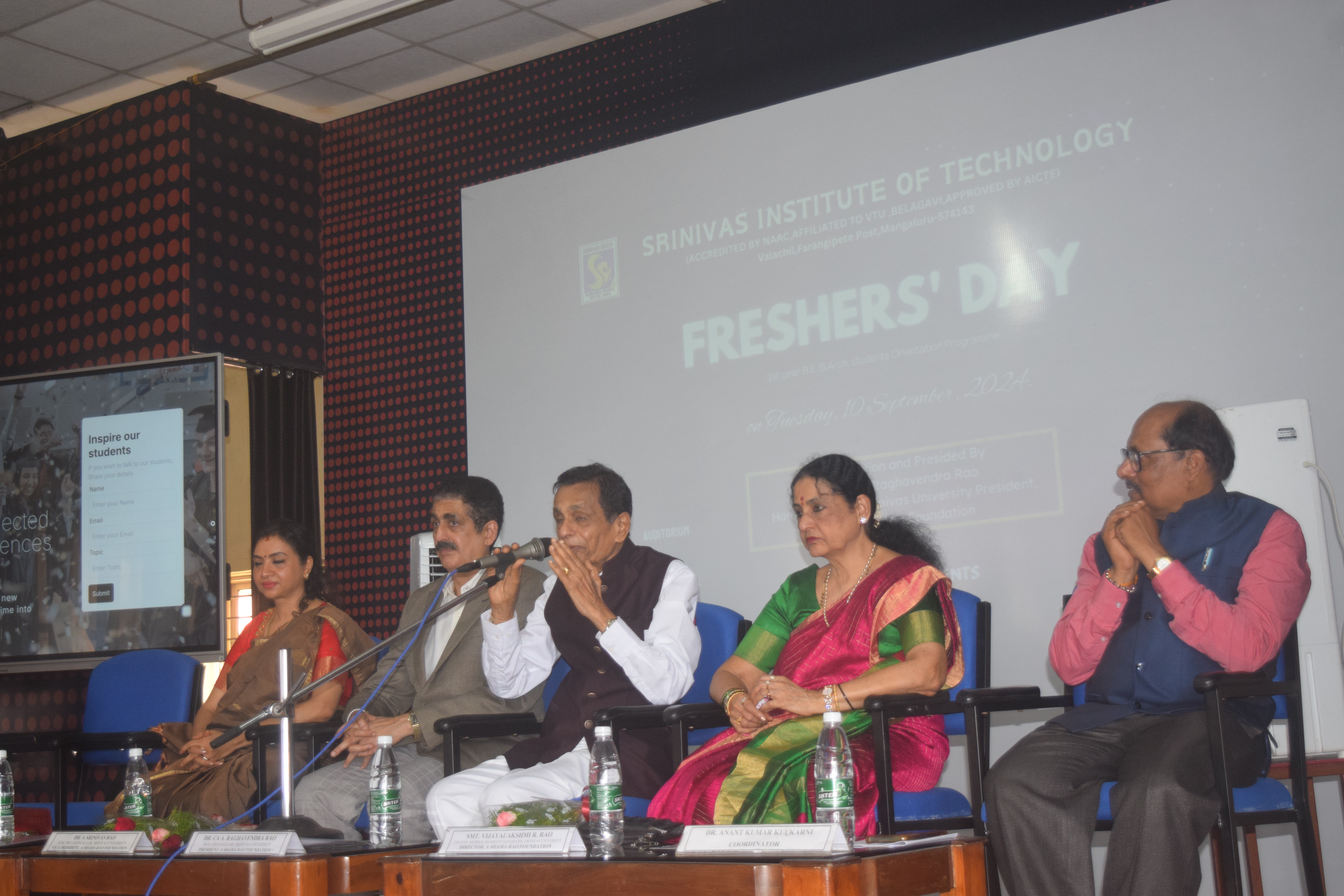 Srinivas Institute of Technology organized a Fresher’s Day/ Orientation Program for the 1st Year B.E./B.Arch students on 10th September 2024. Dr CA A Raghavendra Rao,Chancellor Srinivas University,President,A Shama Rao Foundation,Mangaluru in his presidential remarks said that the students should become leaders in their area of specialization and also he stressed the importance of communication skill that one should have to reach the good heights. Dr A. Srinivas Rao, Pro Chancellor,Srinivasa University Vice President A Shama Rao Foundation,Mangaluru has advised students to contribute for the advancement of Science and Technology, He spoke about the numerous opportunities available in India's growing economy and encouraged students to think innovatively and take up projects that can positively impact society. Trustee Member Smt. A. Vijayalakshmi R. Rao informed the students to bring good name to the institution as well as for their parents. Smt. Mitra S. Rao, Member, Board of Governors,Srinivas University, & Secretary, A. Shama Rao Foundation, Mangalore spoke about the importance of values that each students should inculcate in their student life and throughout, . She addressed the distractions posed by social media, urging students to engage actively in social interactions rather than becoming overly absorbed in mobile phones and social media platforms. During the event, Dr. CA A. Raghavendra Rao sir also launched the new Alumni Website, developed by Prof. Madhusudhan S who is also an alumni of SIT 2019 batch, along with Mr. Adarsh S M of 7th Semester AI & ML, Mr. Pratham Shetty of 5th Semester AI & ML. The website aims to strengthen the connection between alumni and the institution. Prof. Jayram Thumbe, handled a session on “Engineering: A Success Path”. Parents, newly admitted students expressed their views on this occasion. Dr. Shrinivasa Mayya D, Principal of the college, welcomed the gathering and briefly introduced the management, college and Head of Various Departments, The invocation prayer was led by Ms. Deeksha Sharma and her team from the 2nd year of Computer Science Engineering. The vote of thanks was delivered by Dr. Anant Kumar Kulkarni, Head of the Department of Mathematics. The event was smoothly conducted with Dr. Sumana V S and Prof. Rashmi serving as the Masters of Ceremony
