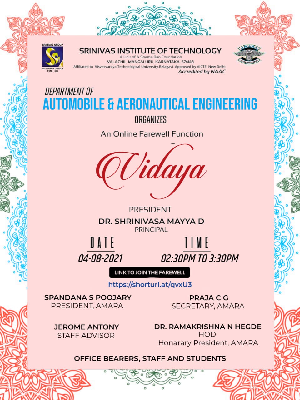 The valedictory function of the Automobile & Aeronautical Association (AMARA) and the farewell function for the final year Automobile & Aeronautical Engineering students was organized by the department of Automobile & Aeronautical Engineering, Srinivas Institute of Technology, Mangaluru on 04-08-2021 in online mode through webex meeting. The occasion was presided by Dr. Shrinivasa Mayya D, Principal, Srinivas Institute of Technology. In his presidential remarks, congratulating the outgoing students Principal advised the follow the “six basic success mantra” to succeed the upcoming life with utmost dedication and confidence. He added that, due to the pandemic all have learnt many things in our lives and also wished them to enjoy each and every moment of life. Dr. Ramakrishna N Hegde, Head, Dept. of Automobile & Aeronautical Engineering, congratulated the outgoing students on this occasion and inspired the students to adhere themselves to ABCDE Sutra viz. right Attitude, right Behavior, high Confidence, utmost Dedication and better Effectiveness & Efficiency. He added that, many activities were not conducted due to pandemic and assured a planned, blended approach in the upcoming year. Students shared their feedback during this occasion. The faculty advisor Mr. Jerome Anthony briefed the association activities report for the year 2020-21. Ms. Suhana Khanam welcomed the gathering. Master of ceremony was done by Mr. Ashwin Kumar and Ms. Suhana Khanam. Mr. Nitesh Biradar, proposed the vote of thanks. The event was conducted successfully with the support of faculties of Automobile and Aeronautical Department, HOD, Principal and Management.