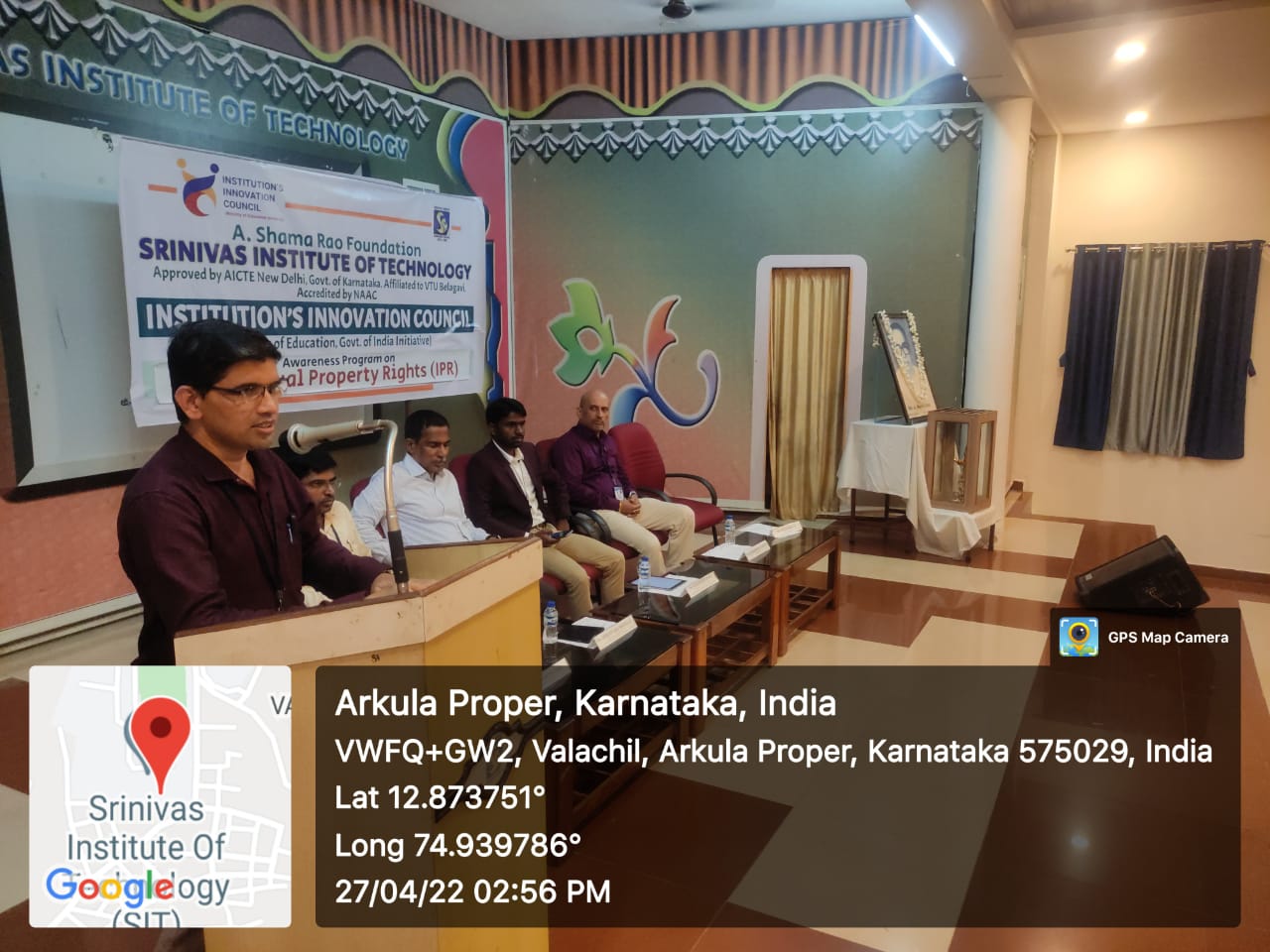 Institution's Innovation Council (IIC) in association with the Intellectual Property Rights (IPRs) Cell has organized an Awareness program on Intellectual property rights (IPRs) under Kalam Program for Intellectual Property Literacy and Awareness (KAPILA) in association with AICTE and National Intellectual Awareness Property Mission (NIPAM) on 27th April 2022 at the institute's Seminar hall. Presiding over the inaugural session, the Principal, Dr. Shrinivasa Mayya D., who is also the President of IIC, encouraged students to get awareness on the IPRs that will help them in the process of innovation. The convener of the IIC Dr. Ramakrishna N Hegde, elaborated on the various IPRs and how they would help startups in protecting their rights. He also briefed about IIC. Soon after the formal inauguration, Resource Person Mr. Ramashish Paul, Examiner of Patents and Design Intellectual Property Office (IPO), Chennai, handled a session on Awareness program on Intellectual Property Rights (IPR). The session covered topics: basic knowledge of Intellectual property rights (IPR), importance of IP, Patents, Trademarks, Copyrights and also discussed some best practices followed and case studies. Students and faculty of the institute actively participated in the program. Dr. Shankar K S Head of Mechanical department coordinated the event. The Master of Ceremony was done by Prof. Jayaram Thumbe of Mechanical department.