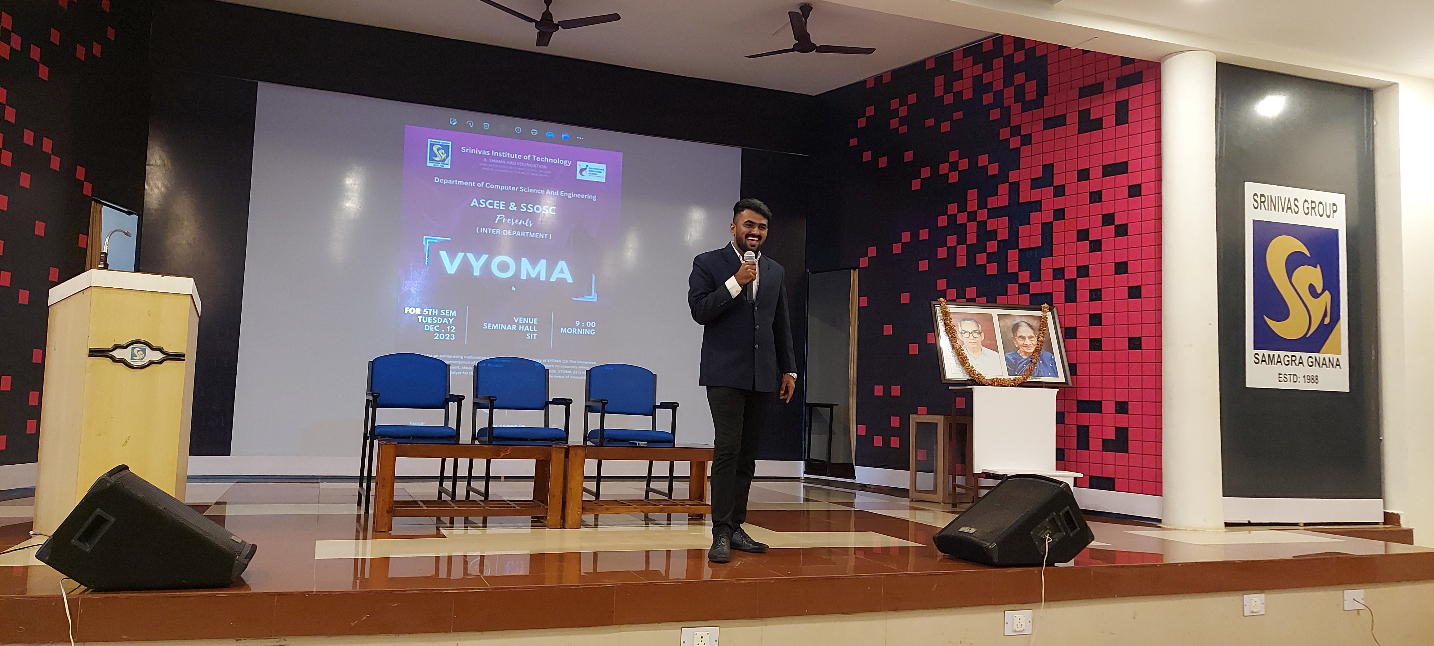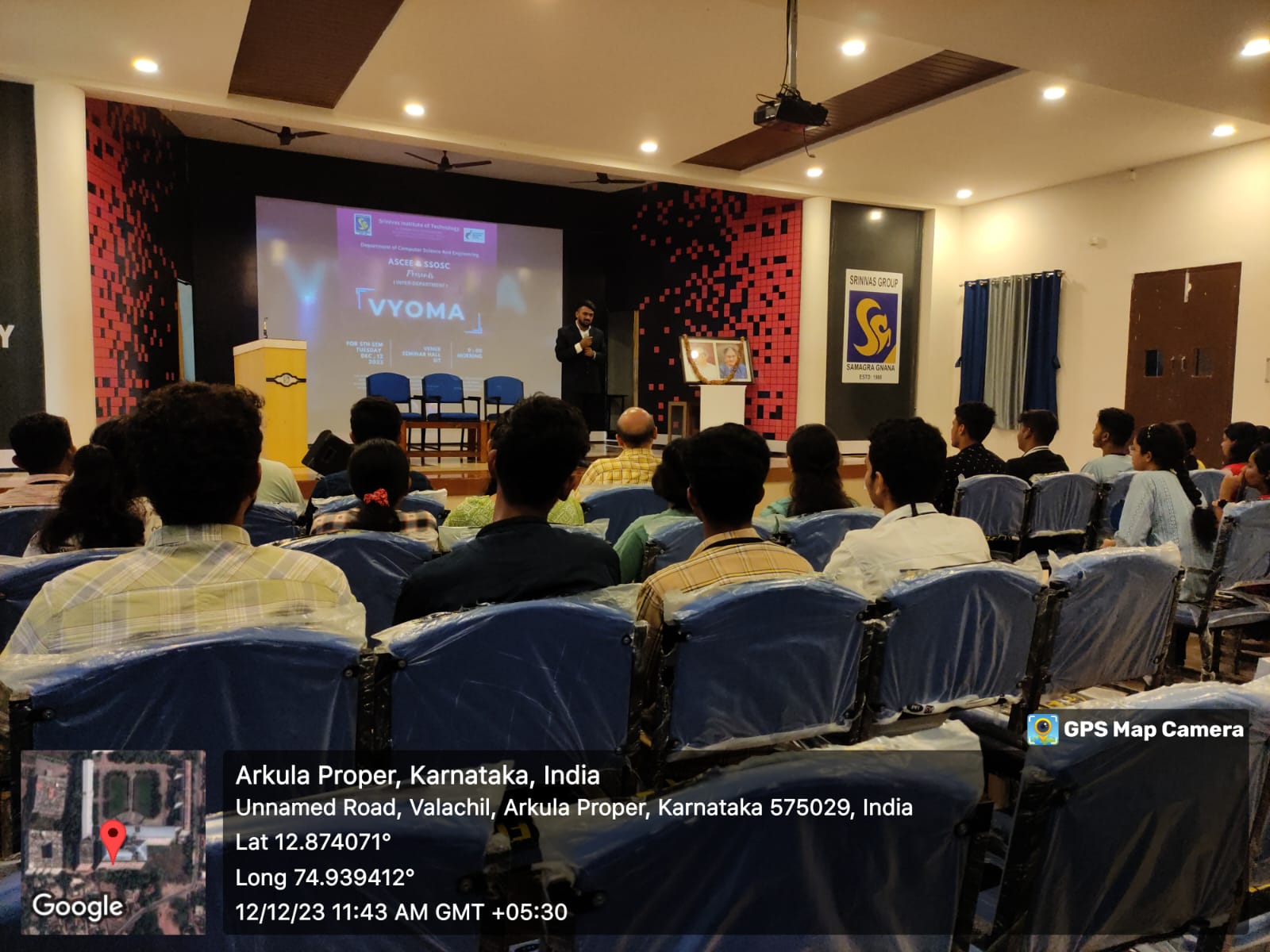A career guidance programme- “Meet your future” was held at Srinivas Institute of Technology, Valachil, Mangaluru on Tuesday 12th December 2023 by the Computer Science & Engineering Department student association ASCEE for the final and pre-final year students. Mr. Tanush Shetty, Application Engineer, IBM, Mysuru was the Resource Person.Mr. Tanush Shetty, in his address said that the “students need to be self-reliant and confident to lead a successful life.” Mr. Tanush Shetty, inspired all the students with a detailed discussion on the ample of opportunities and career options they can choose after Engineering. He also briefed the students regarding the importance of soft skills that transforms overall personality development. The session concluded with an interaction round amongst the students.