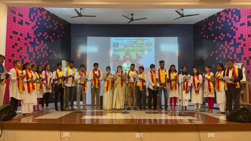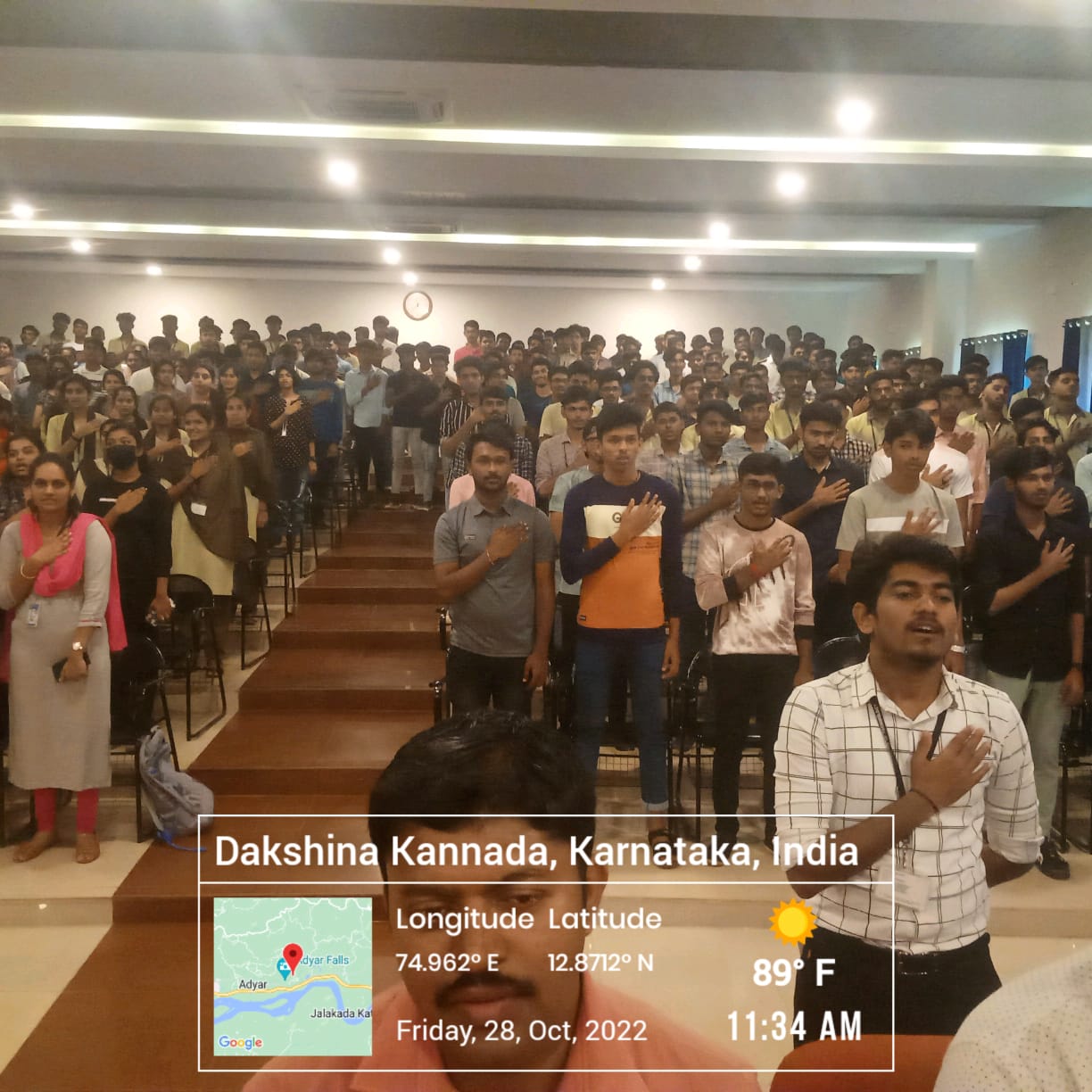 On 28-10-2022, Friday from 11.00AM we celebrated “Koti Kanta Gayana” program in our college auditorium in connection with 67th Kannada Rajyotsava as per the direction and guidance of department of kannada and sankruthi, Bengaluru and VTU Belegavi.Principal of the college Dr. Shrinivasa Mayya D inaugurated the program, also suggested and guided for the program.Co-ordinator of the Aisiri Kannada Sangha Prof. Sudheendra H.N., Assistant Professor, Dept of mechanical Engineering said the importance of celebrating this event.As per the direction from the govt more than 350 students were registered for this event and involved themselves to sing Naadageethe and mentioned various kannada songs by the govt.Co-ordinator of the Lalitharanga- Cultural committee Prof. Sumana V.S., Assistant Professor, Dept of Chemistry was led the kannada oath taking process.Student president of Aisiri Kannada Sangha Ms. Vidyashree welcomed the gathering. Dr. Shankar K. S., HOD of mechanical engineering department proposed the vote of thanks. Mr. Ijlan was anchored the program. Students and staffs (Teaching and Non-Teaching) of the college witnessed the made this program a grand Success.