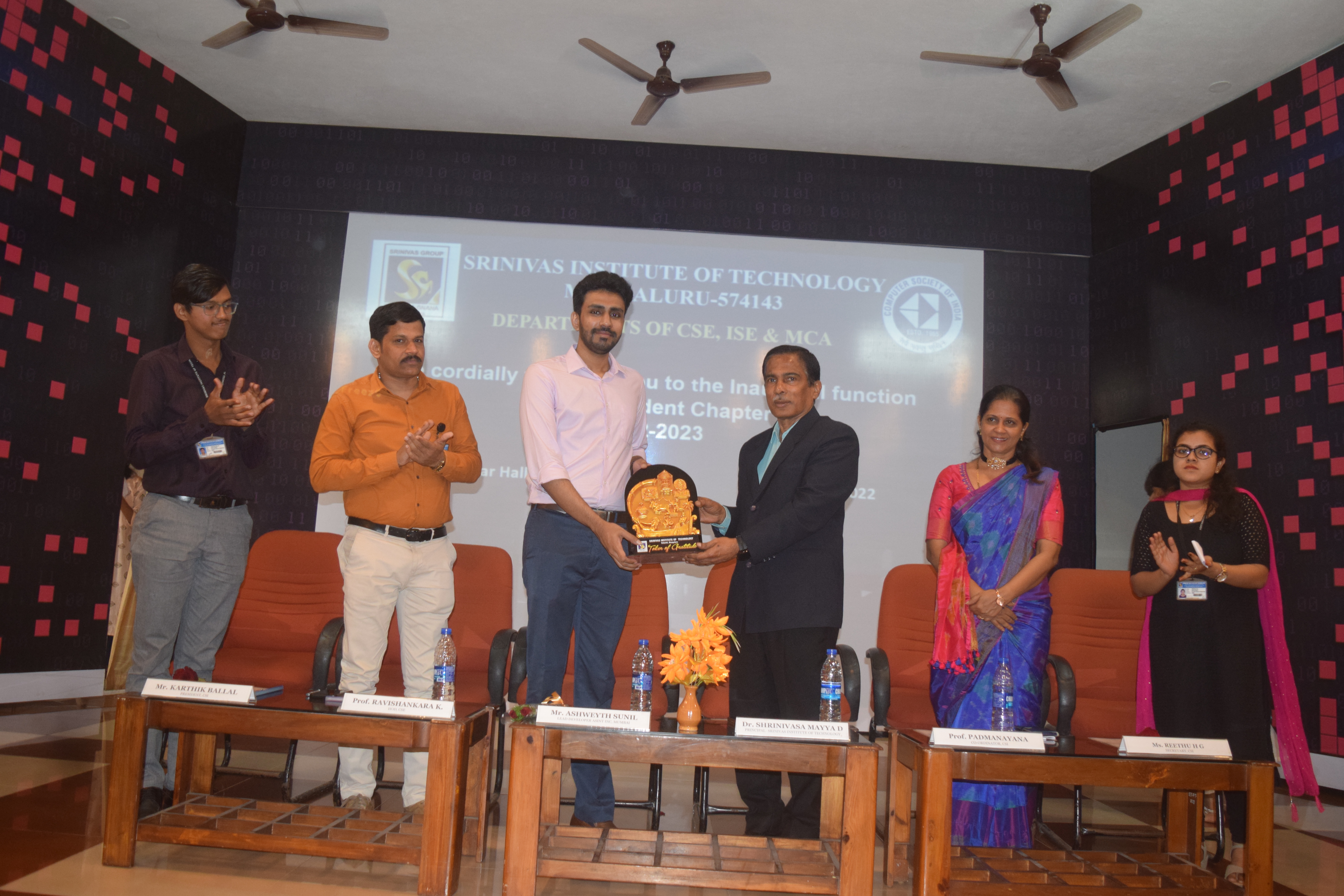 The inaugural function of the Computer Society of India (CSI) student chapter of Srinivas Institute of Technology , Valachil, Mangaluru, for the year 2022-23 was held on Saturday 10th December 2022. The program was inaugurated by the Chief Guest Mr. Ashweyth Sunil, Lead Developer, ASInt Inc.Mumbai. Mr. Ashweyth Sunil in his inaugural address said “Future generation must focus on specilizing their career growth using technology advancement”. He also told about the post covid technology changes.The Android application developed by Mr.Ajeeb P and Mr.Vignesh for CSI was released by the chief guest. Dr. Shrinivasa Mayya D, Principal of the college, in his presidential address, urged the students to organize maximum number of events under CSI and also take up initiatives to shape their ideas into realities. Prof. Ravishankara K, H.O.D, CS&E Department, in his address appreciated the students for their active participation in the events conducted so far and also told students to improve their skillsets using these type of associations. Prof. Padmanayana , CSI student branch Coordinator briefed about the objectives of the association and introduced the offfice bearers of CSI 2022-23. Mr. Shashanka Vice President, CSI outlined the activities conducted so far and also proposed the plan of action of 2022-23.Mr. Karthik Ballal, President, CSI welcomed the gathering and Ms. Reethu H G, Secretary, CSI delivered the vote of thanks. The program was compered by Ms. Anusha Shetty and Ms. Deeya. The formal function was followed by a technical talk on “ Build your carrier using SAP ” by Mr. Ashweyth Sunil, Lead Developer, ASInt Inc.Mumbai.