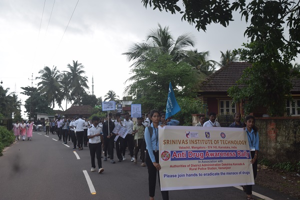 Srinivas Institute of Technology, Valachil Mangalore in association with authorities of district administration, Dakshina Kannada and Rural Police Station, Vamanjoor conducted a “Anti Drug Awareness” Rally near the college campus on 28th July 2023. Dr. Shirinivasa Mayya, Principal of the college, Dr. Anant Kulkarni, Student Welfare Officer of the college, Police Personnel from Rural Police Station, Vamanjoor, staff and hundreds of students from various branches participated in the mega rally.