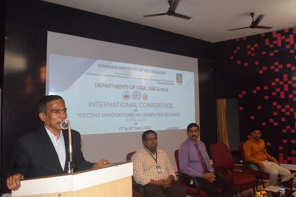 An International Conference on “Recent Innovations in Computer Science”- (ICRICS-2022)” was organized by the Departments of Computer Science & Engineering, Information Science & En-gineering and Master of Computer Applications on June 17th and 18th 2022 at Srinivas Institute of Technology, Mangaluru. Dr. Hamada Ali Mohamed Ali Nayel, Professor, Dept. of CS, Benha Uni-versity, Egypt was the Chief Guest of this conference. Dr. Shrinivasa Mayya D, Patron and Principal of the college, in his inaugural address said that this conference drives in a special opportunity to bring together professors, researchers and scholars around the globe, and serves as a platform to deliver innovative research results and latest trends and development in the fields of Computer Science and Engineering. He also insisted that constant updation of technical knowledge in new research areas is necessary for the academic growth of oneself. The conference overview was presented by Prof. Ravishankara K, Convener & H.O.D, De-partment of CS&E . The Inaugural session also witnessed the key note addresses by eminent speak-ers Dr. Hamada Ali Mohamed Ali Nayel, Professor, Dept. of CS, Benha University, Egypt on the topic Biomedical Natural Language Processing and Dr. Madhu Soodhanan Thoppian, Advisory IT Specialist, IBM, Malaysia on the topic Data Safety Technologies.The welcome speech was delivered by Dr. Shashidhar Kini, H.O.D, Department of MCA and the vote of thanks was proposed by Dr. Anoop B. K, H.O.D, Department of IS&E. Mrs. Padmanayana, Associate Professor and Mrs. Mamatha, Assistant Professor from the Depart-ment of CS&E compered the entire program. The conference brought together some 70 plus research scholars, faculty members, students and key officials nationally and internationally to discuss the recent advances in computer science . All submitted papers were accepted by the committees for presentation both in online and offline mode and to be included in the proceedings. Four parallel tracks were held in which a total of more than 70 scientific papers were presented.