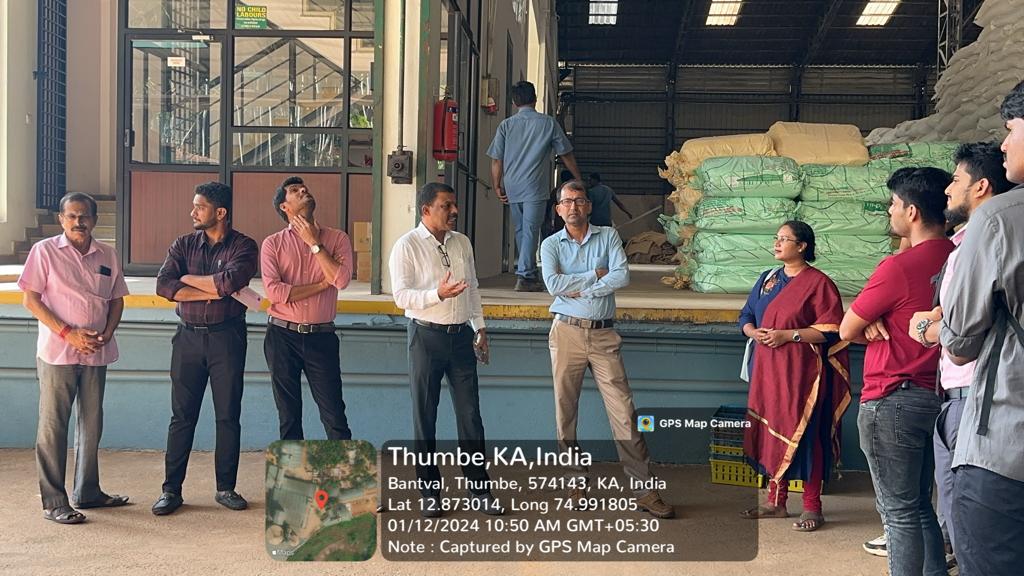 An exposure and field visit to “Bharath Agrovet Industries” Thumbe, Mangalore for problem identification was organized under the banner of VOLMAS in association with Institution’s Innovation Council on 12th January, 2024. The students of first year MBA took part in the field visited and interacted with the management of Bharath Agrovet Industries and discussed about the various issues faced by the company in the current economic environment. A total of 102 students took part in the field visit accompanied by 2 faculty members from the department. The students had the opportunity to visit the factory and see the manufacturing process involved in producing the chicken feed.