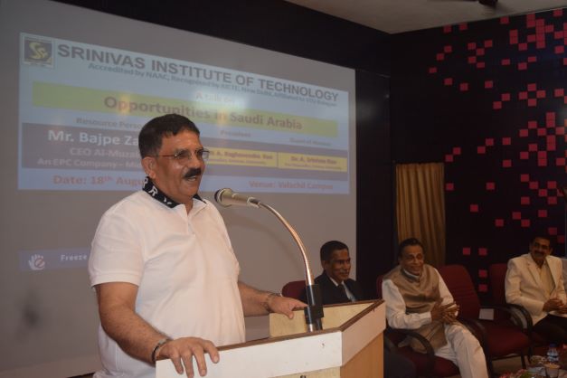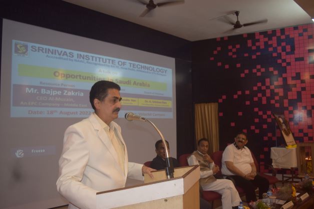 Srinivas Institute of Technology, Valachil organized a talk on “Opportunities in Saudi Arabia” for Engineering, MBA and MCA students on 18th August 2022. Mr. Bajpe Zakria , CEO- Al-Muzain, An EPC Company in Middle East was the chief guest and Resource person of function. shared his experience with students as a successful entrepreneur. The chief guest in his talk spoke about spoke his experience in the past and provided valuable information on various job opportunities in Saudi Arabia specially in the oil and gas sector, with the vision of 2030. The president of the function Dr. CA. A. Raghavendra Rao, Chancellor – Srinivas University, President -A Shama Rao foundation, Motivated the Students and encouraged them to acquire more and more skills in their life. The guest of honour Dr. A. Srinivas Rao, Pro-Chancellor-Srinivas University and Vice President - A Shama Rao Foundation, spoke about need of exploring various job opportunities among young engineers. Principal, Dr. Shrinivasa Mayya D was present on the occasion. He Welcomed and introduced chief guest on this occasion. Dr. Dheeraj Hebri, Placement officer rendered vote of thanks.