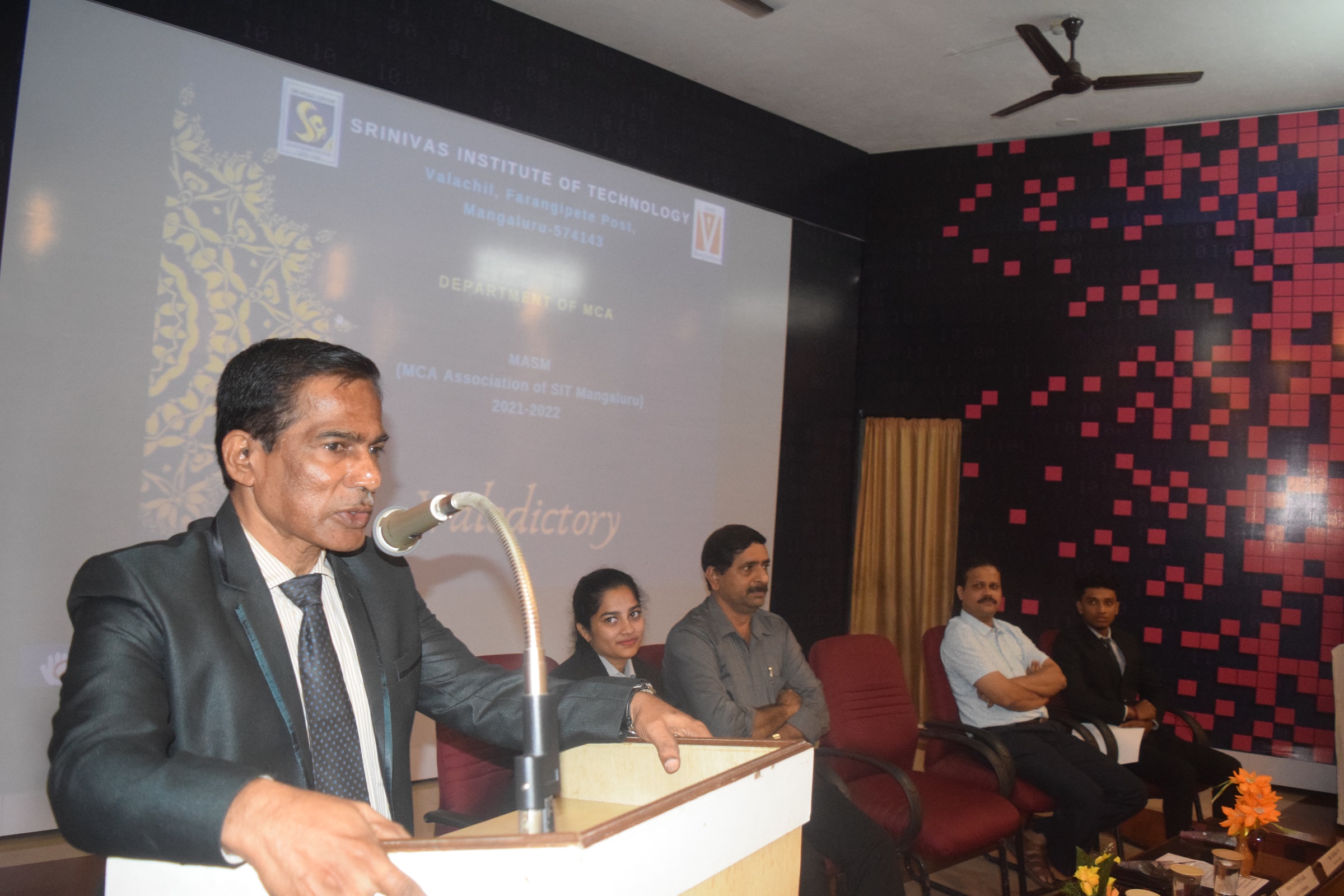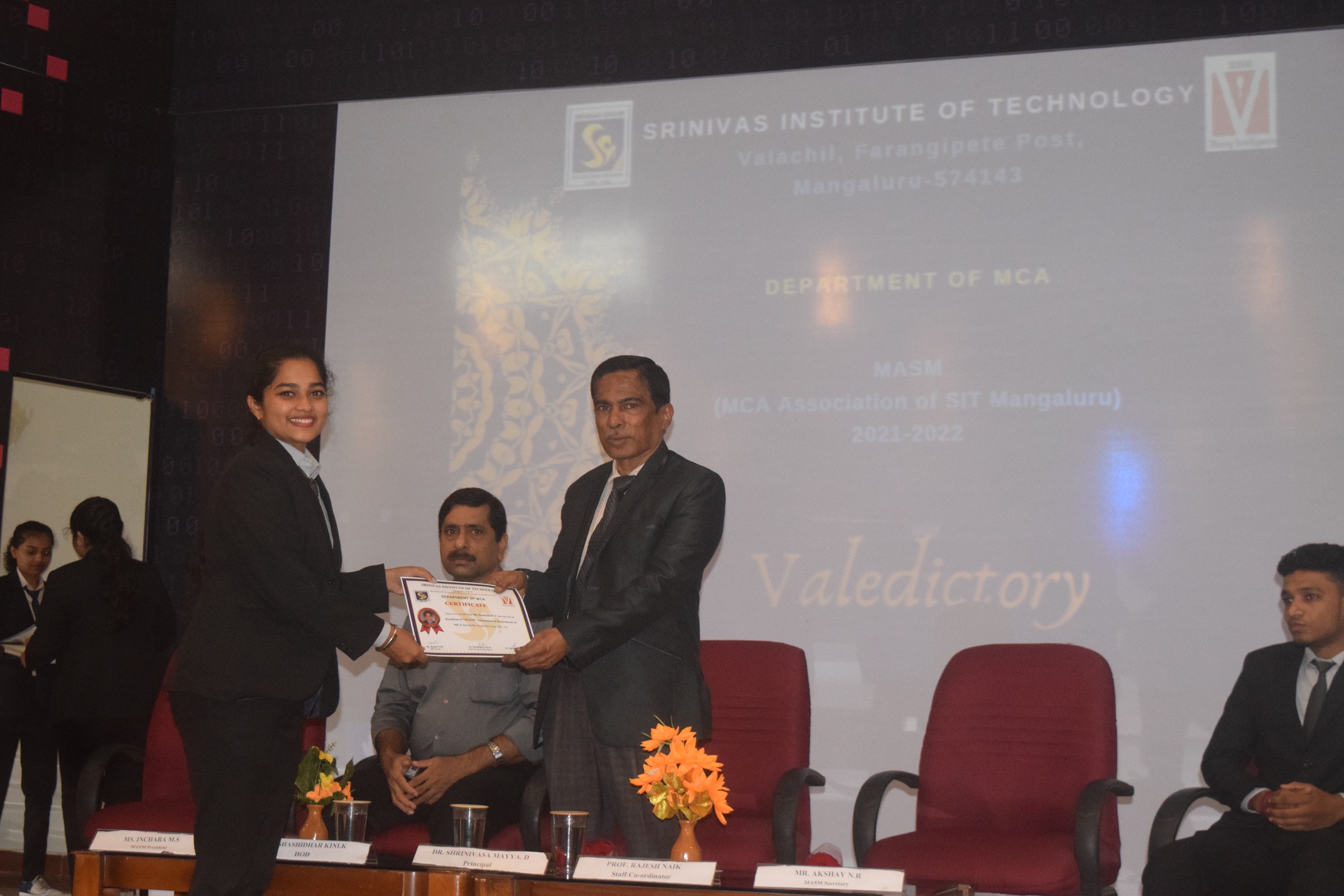 The valedictory ceremony of the MCA Association of SIT Mangaluru (MASM) was held on Tuesday 19th July 2022 in Seminar Hall, commenced with the presence of dignitaries. The dignitaries are Dr. Shrinivasa Mayya D, the president of the valedictory program, Principal, SIT, Mangaluru, Dr. Shashidhar Kini K, Head of the Department of MCA, Mr. Rajesh Naik, Faculty Advisor of MASM, Ms. Inchara M S, President of MASM and Mr. Akshay N R, Secretary of MASM. The program was followed by a prayer song by the student Nidhi N S. from II semester MCA. Ms. Inchara M S, the president of the MASM association formally welcomed all the dignitaries present on the dais, teaching and non-teaching staff and students. Dr. Shrinivasa Mayya D, president of the function, awarded the MASM office barriers by giving the certification.Dr. Shashidhar Kini K, Head of the Department of MCA addressed the students and appreciated the former MASM members for their work and wished for more activities in the future.Dr. Shrinivasa Mayya D, addressed the students and MASM barriers. He praised the activities conducted by MASM and briefed about the importance of hard work required to reach future goal. At the last, Ms. Yashwini, Joint Secretary of MASM, offered a vote of thanks to all. She thanked all the guests and participants for gracing the occasion with their solemn presence.