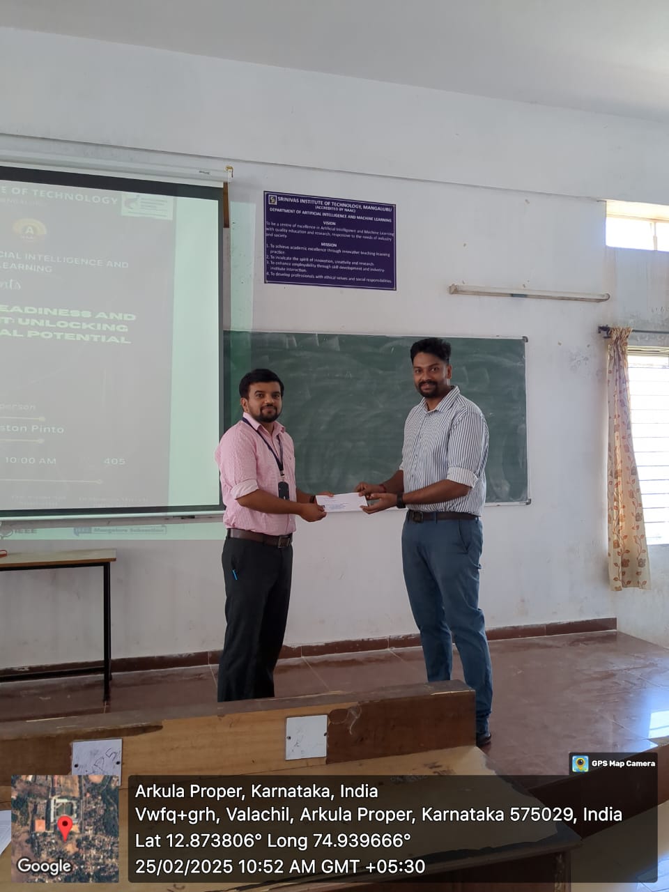 Innovation Readiness and Development: Unlocking Technological Potential” The Department of Artificial Intelligence and Machine Learning (AIML) at Srinivas Institute of Technology, Mangaluru, organized a technical session titled Innovation Readiness and Development: Unlocking Technological Potential on 25th February 2025 under the Institution’s Innovation Council (IIC). The session featured Prof. Ajay Prinston Pinto as the resource person, who shared valuable insights on fostering innovation and leveraging technological advancements for development. The event aimed to equip students with the necessary knowledge and skills to enhance their innovation readiness. The program was coordinated by Prof. Nivin K S from the AIML department, with Dr. Praveen Shenoy serving as the IIC Coordinator. The event was conducted under the guidance of Prof. Daya Naik (HOD, AIML) and Dr. Shrinivasa Mayya D (Principal, SIT). The session provided an engaging platform for students to explore innovation-driven growth and its role in emerging technologies.