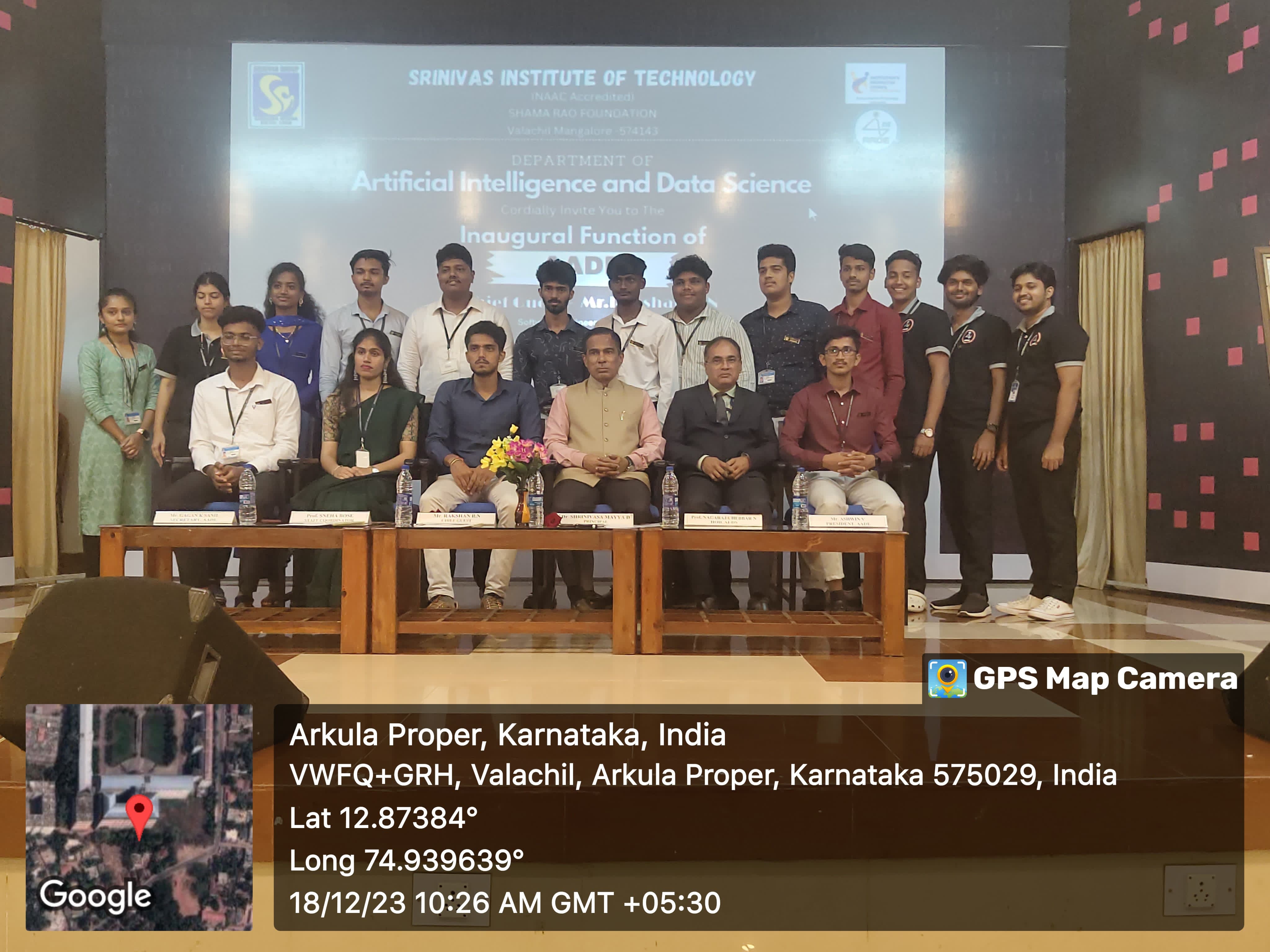 Department of Artificial Intelligence and Data Science organised Association Inauguration of Artificial Intelligence Data Science Educatee(AADE) on 18th December 2023. Mr Rakshan B.N, Software Engineer at HashedIn by Deloitte, was the chief guest. The function was presided by Dr. Shrinivasa Mayya D, Prinicipal, Srinivas Institute of Technology, Prof. Nagaraja Hebbar N, Head of AI&DS department and Prof. Sneha Bose, Faculty Coordinator, Department of AI&DS. Mr. Ashwin V, President of AADE gave the welcome address, Ms. Mokshashree MN from 3rd year AI&DS introduced the chief guest to the gathering. Mr. Rakshan spoke on GenAi, briefed it's importance, and educated the students about the same. Prof. Sneha Bose read out the action plan for the academic year 2023-24. On this auspicious occasion, badges were issued to office bearers of AADE for the academic year 2023-24.Dr. Shrinivasa Mayya D, the Principal gave the Presidential Address. Prizes and certificates were issued to academic toppers, winners of various events, participants, and event organizers. Mr. Gagan K Sanil, Secretary, AADE gave vote of thanks.