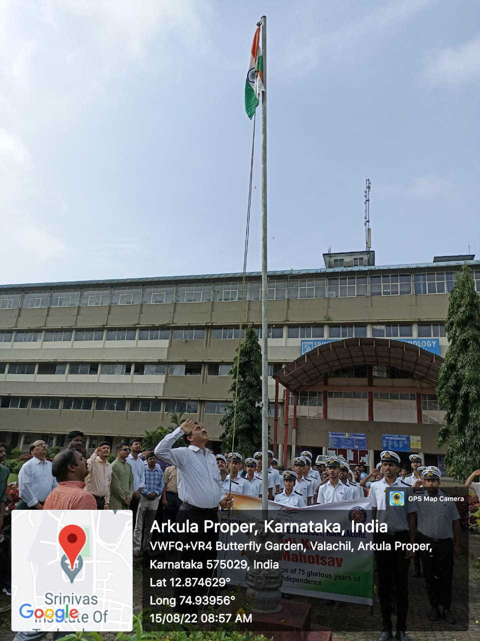 Srinivas Institute of Technology celebrated 75th Independence Day on 15th August 2022. A flag Hoisting ceremony was conducted on the occasion. Dr. A.R.Shabaraya, Principal, Srinivas College of Pharmacy was the chief guest on the occasion and hoisted the National Flag. Prof.Tony Sebastian, Sports Coordinator, Dr. Ananth Kumar Kulkarnai, Student Welfare Officer, other staff members and students were present on the occasion.