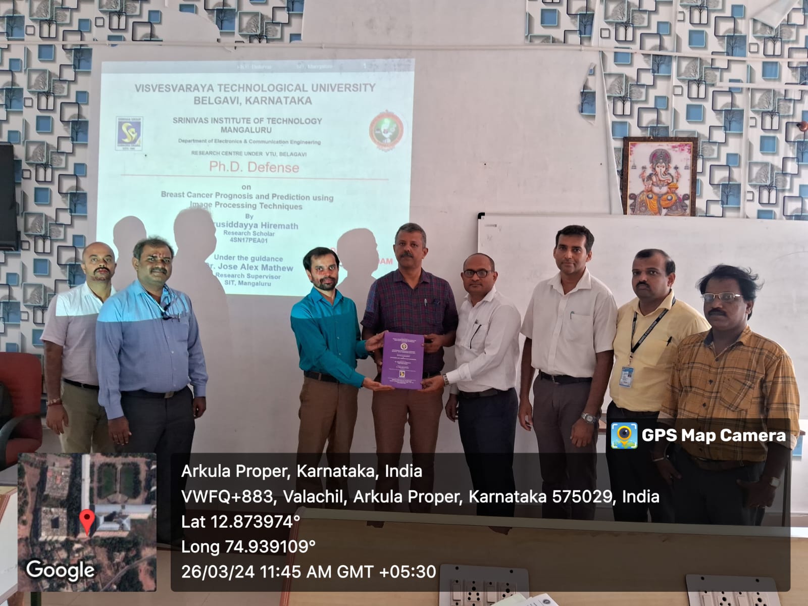 Mr. Gurusiddayya Hiremath (USN: 4SNI7PEA01), a Ph.D. scholar at the Department of Electronics & Communication Engineering, Srinivas Institute of Technology, Valachil, Mangaluru, successfully defended his Ph.D. thesis on 26/3/2024. The thesis, titled “Breast Cancer Prognosis and Prediction Using Image Processing Techniques,” was carried out under the supervision of Dr. Jose Alex Mathew, Research Supervisor at the Department of ECE, Research Centre, Srinivas Institute of Technology. Dr. Kartik K, from Vellore Institute of Technology, served as the External Examiner.