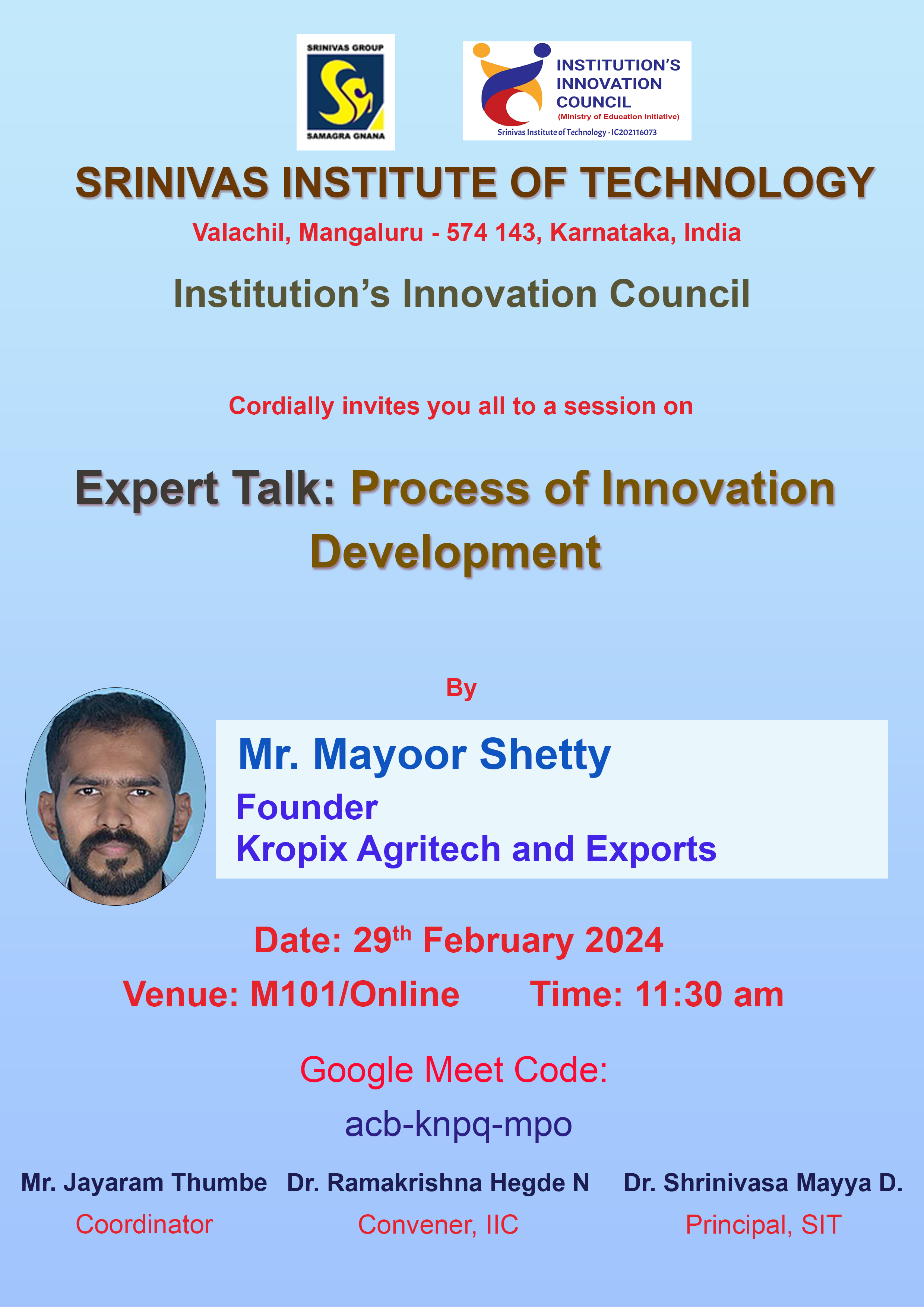Institute’s Innovation Council (IIC), Srinivas Institute of Technology, organised an expert talk on “Process of Innovation Development” on February 29, 2024 for the 5th and 7th Semester Marine and Mechanical Engineering Students at Srinivas Institute of Technology, Valachil, Mangaluru. The session was conducted by Mr. Mayoor Shetty, an entrepreneur, Founder of Kropix Agritech and Exports Mangaluru. He is an ex-corporate with 8 years experience in various companies based out of Bangalore. He moved to Mangalore in 2016 and founded a makers space in Bajpe, now a Farmer and working with cacao, chocolate and other fermented products. He is also part of various social causes, Executive member of FIRA.The session was conducted in online mode.Mr. Shetty, in his session briefed about his experiences as an entrepreneur. He stressed upon the need of innovation in farming sector. He has made aware the audience about his way of innovation and use of artificial Intelligence (AI) in the farming sector. He has elaborated on the challenges faced during the implementation of advanced technology and AI in the farming. He also briefed upon the process involved in the drying of cocao that he uses in his farm. Mr. Shetty spoke on the innovations that are required in the irrigation.He has answered the students queries during the question and answer session at the end.The session was coordinated by Prof. Jayaram Thumbe, from the department of Mechanical Engineering. Around 70 students from 5th and 7th semester Mechanical and Marine engineering took part in the session.Principal of SIT, Dr. Shrinivasa Mayya D and IIC convener, Dr. Ramakrishna N Hegde were present