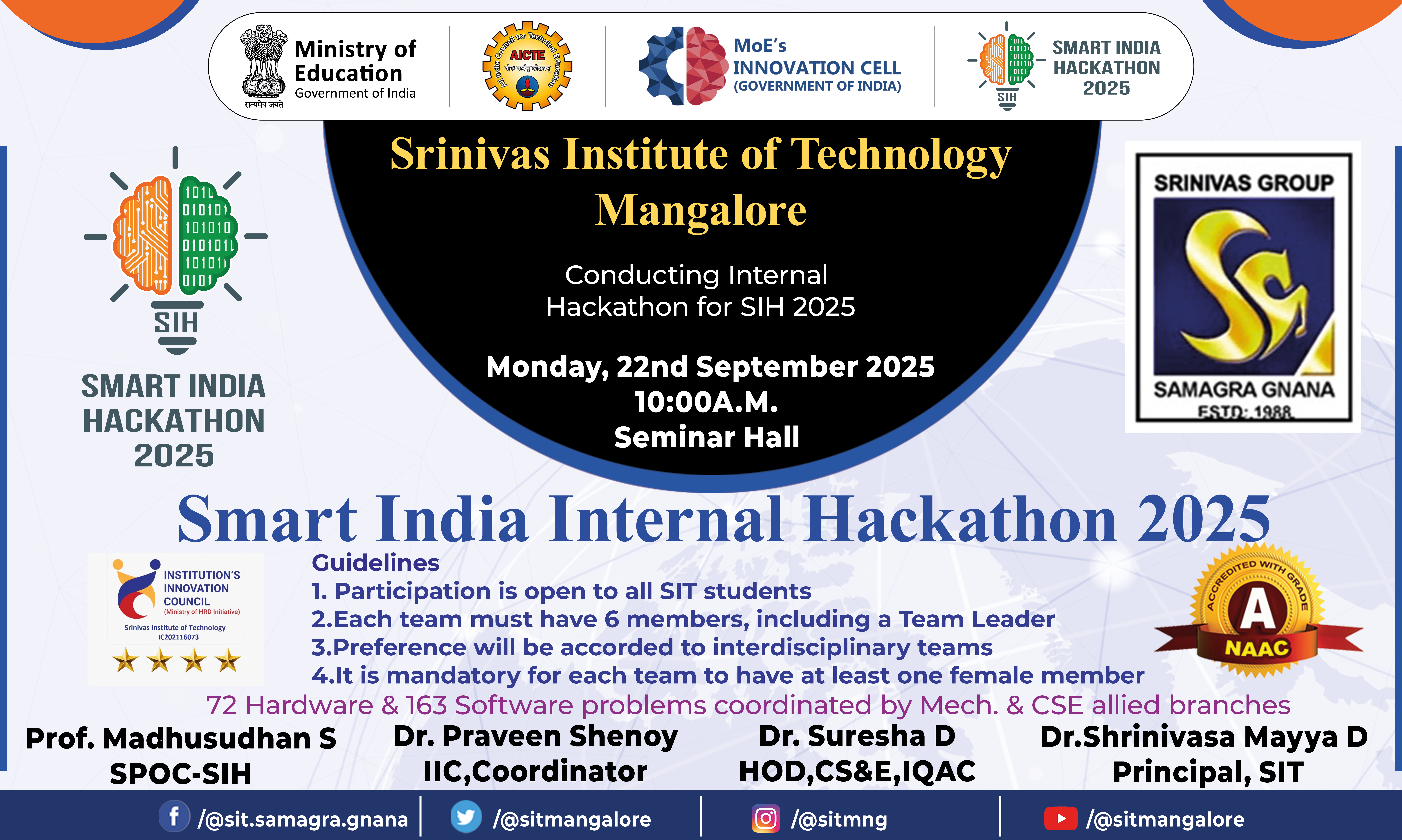 Srinivas Institute of Technology, Mangalore, is excited to announce the Smart India Internal Hackathon 2025 🚀, which will be held on Monday, 22nd September 2025 at 10:00 AM in the Seminar Hall. This event is open to all SIT students and aims to encourage innovation, creativity, and problem-solving skills. Each team should consist of 6 members, including a Team Leader, with interdisciplinary teams highly encouraged and at least one female member mandatory. Don’t miss this opportunity to showcase your ideas and contribute to building solutions for a smarter India!