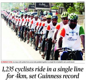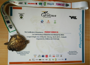 Mr. Pradeep Kumar KG., Assistant Professor, Department of ISE Participated in “Guinness World Record Attempt by INDIA”, Longest Single Line of Bicycles – Moving, on 26-01-2019 at Hubballi, organized by Hubballi Bicycle club.